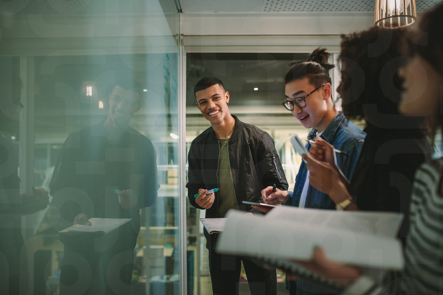 Group of students standing together at blackboard with books. Multi-ethnic university students during workshop.