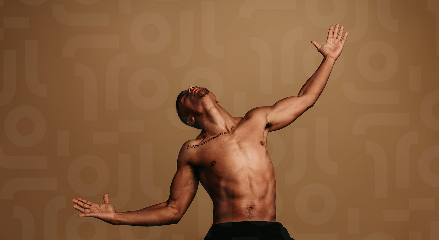 African american man standing on brown background with outstretched arms. Shirtless man with face up and open arms.
