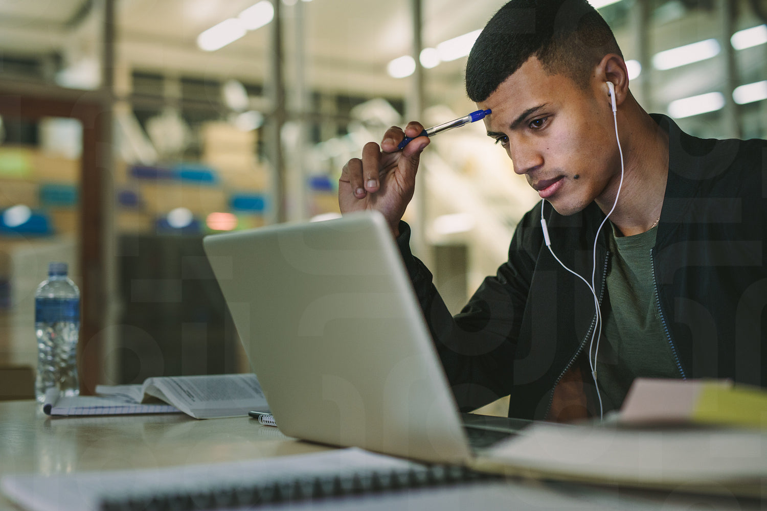 Male student sitting at table looking at laptop and thinking. Young man surfing internet on laptop at university library.