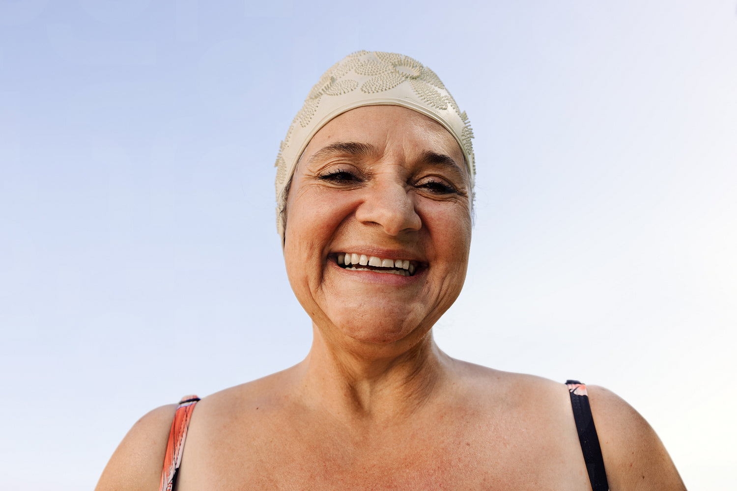 Happy senior woman smiling at the camera in swimwear. Carefree mature woman enjoying her summer vacation at a tropical spa resort. Cheerful elderly woman enjoying herself after retirement.