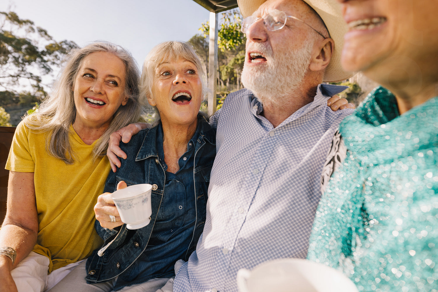 Long time friends having fun together over morning tea. Cheerful elderly people enjoying their summer vacation at a spa resort. Happy senior citizens enjoying themselves after retirement.