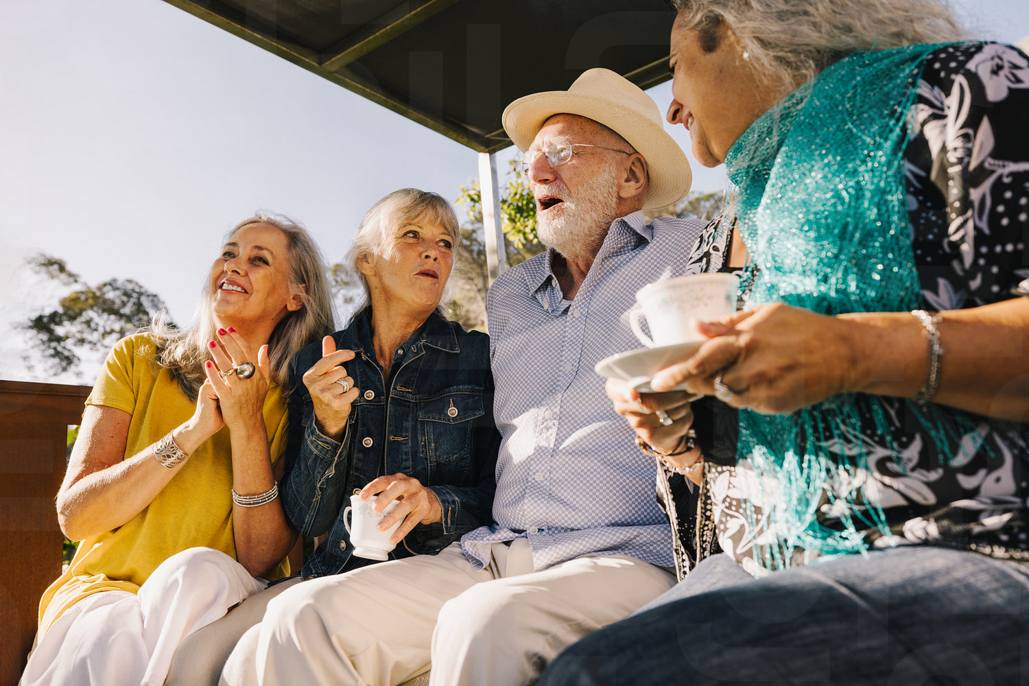 Old time friends laughing happily while having tea together. Cheerful elderly people enjoying their summer vacation at a spa resort. Senior citizens having fun together after retirement.
