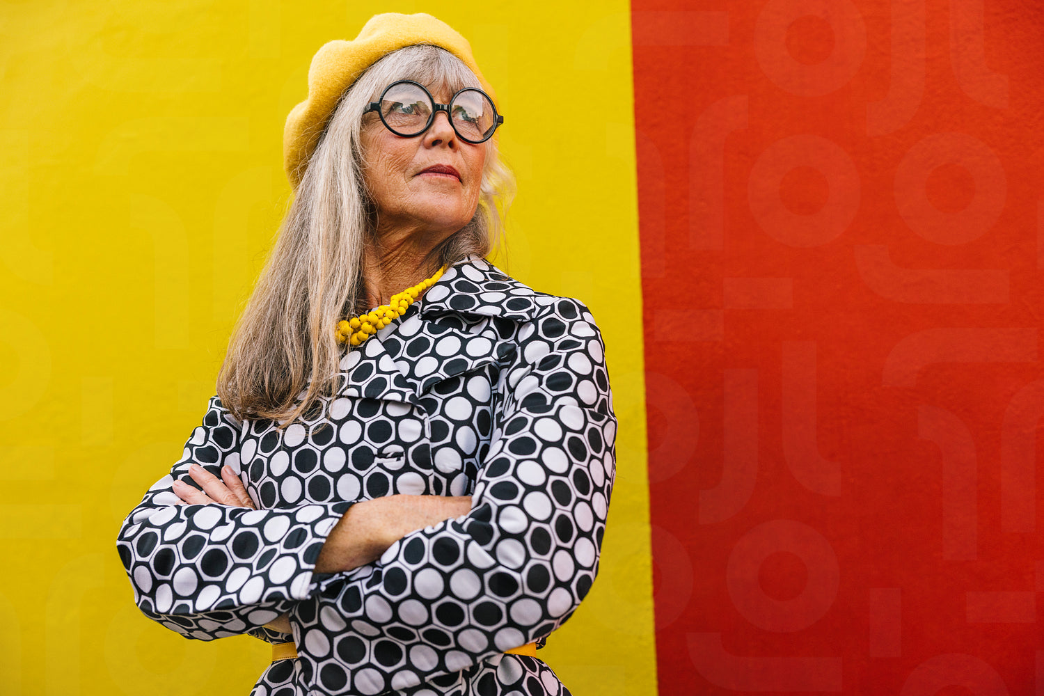 Retired woman looking away thoughtfully against a colourful wall