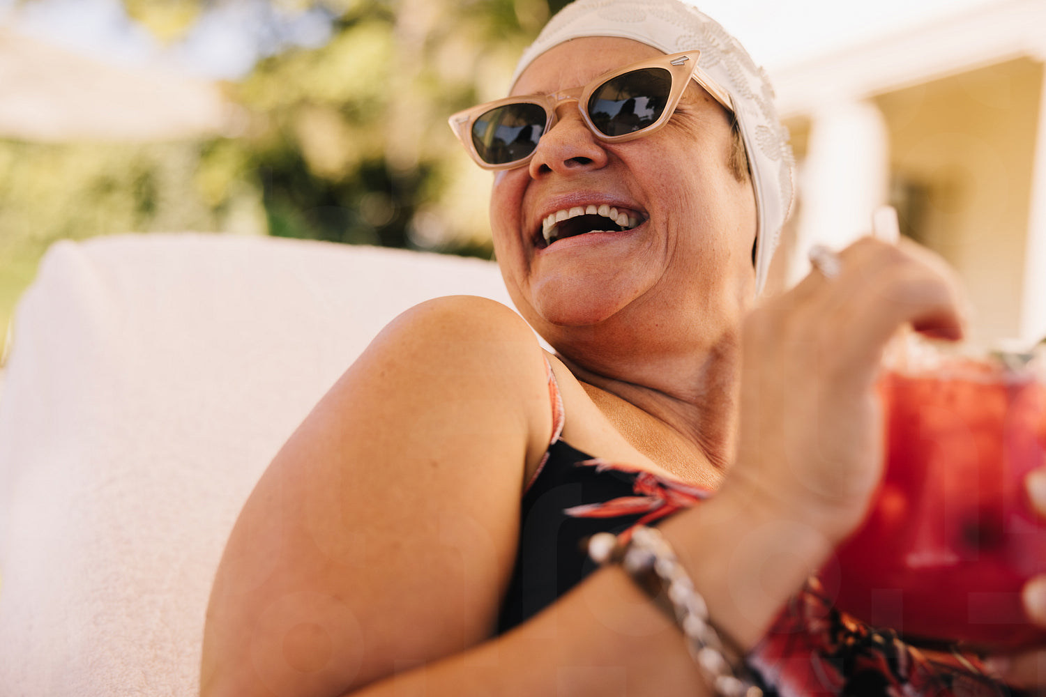 Senior woman enjoying a tiki cocktail while vacationing in the summer. Carefree elderly woman laughing cheerfully while relaxing on a lounger. Happy mature woman enjoying herself after retirement.
