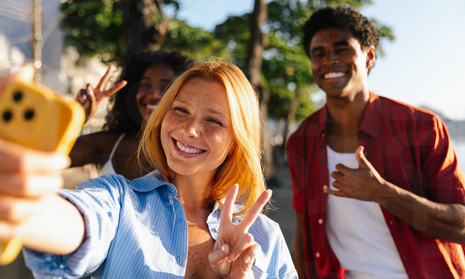 A group of friends is enjoying a sunny summer day, capturing the moment with a cheerful selfie. They are outdoors, smiling and displaying peace signs, conveying a sense of fun and friendship.