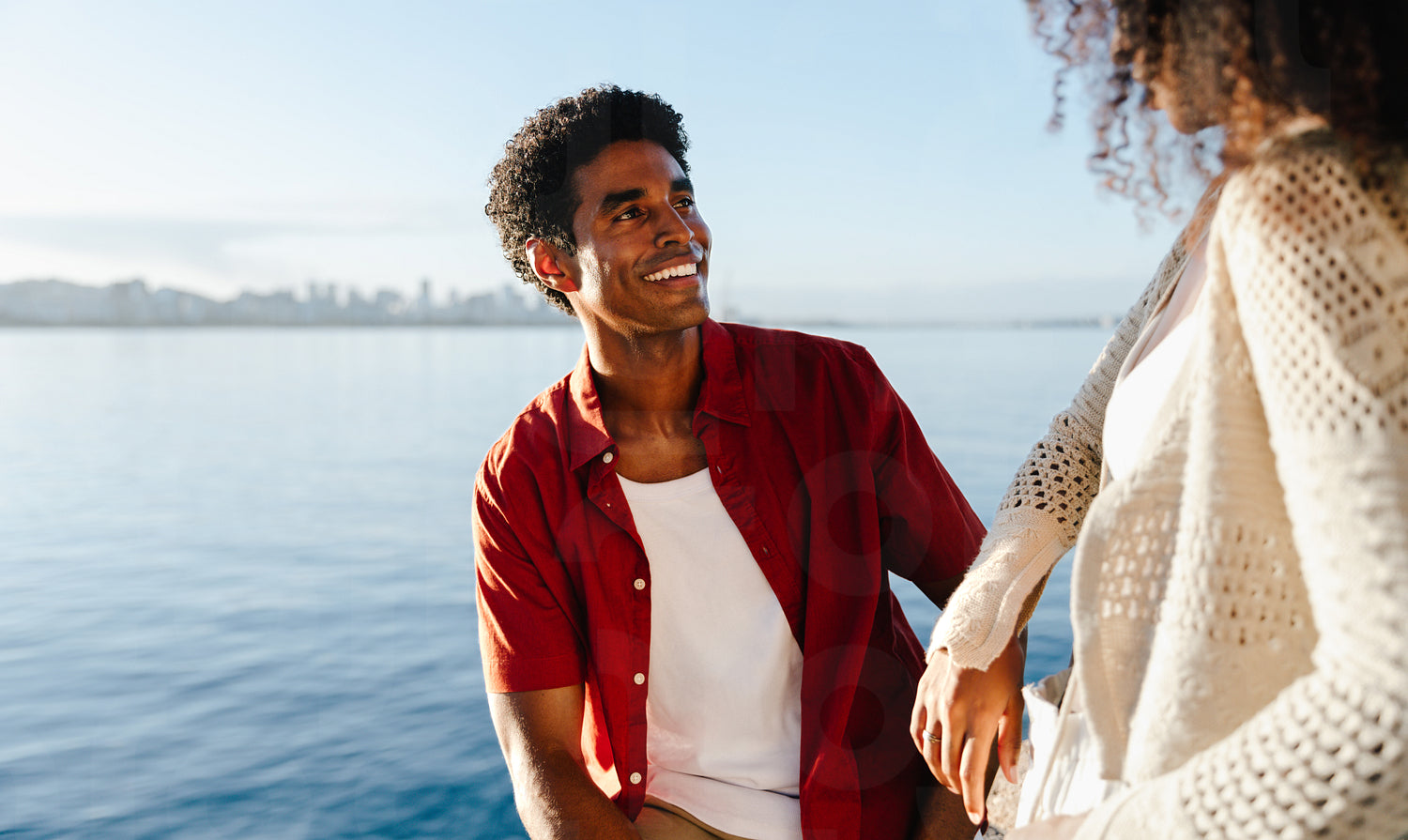 A Brazilian couple enjoys a romantic moment at Mureta Da Urca overlooking the serene waters at sunset. Warm light bathes the scene, enhancing their joyful connection and capturing the essence of love.
