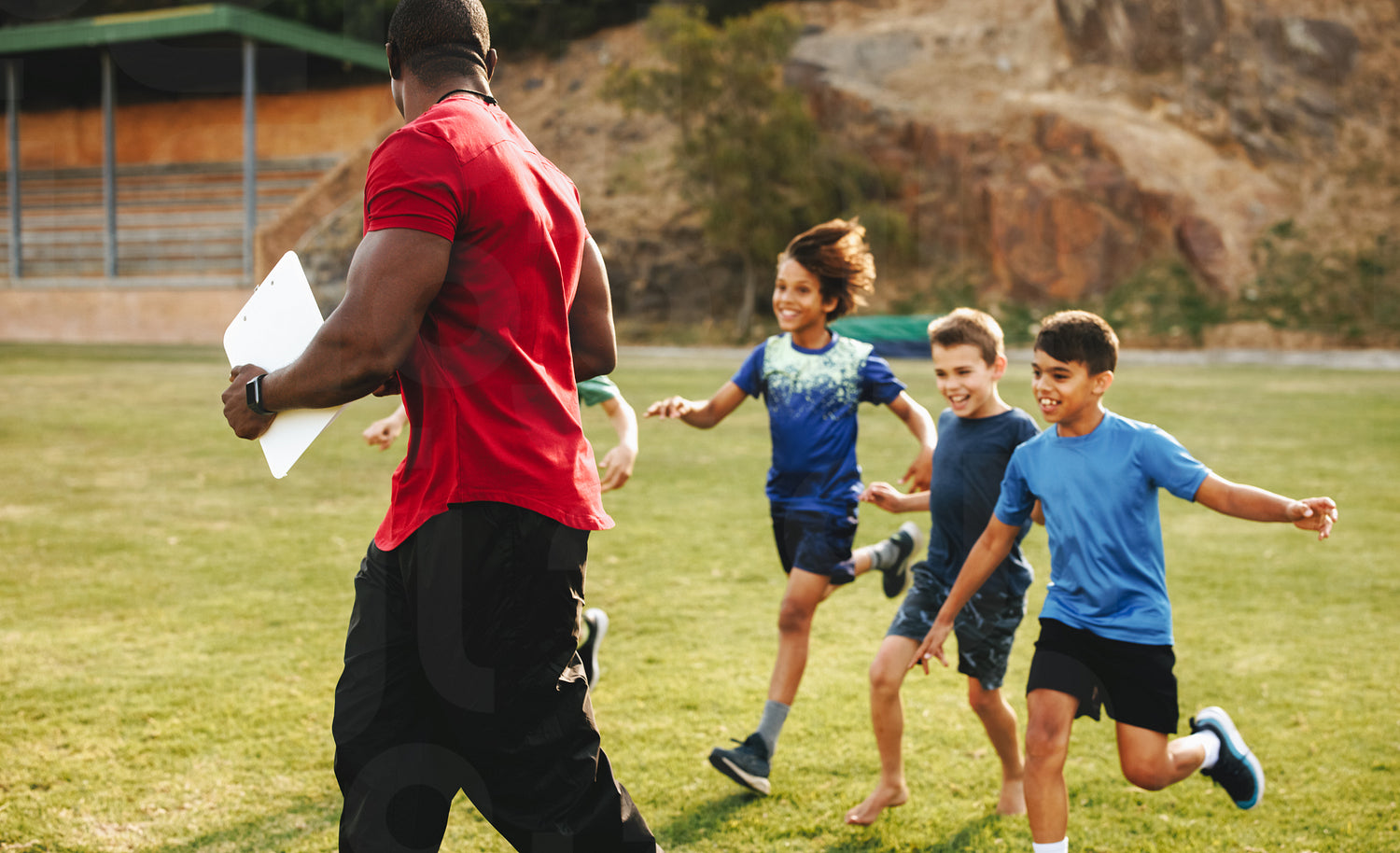 Sports coach getting chased by his sports team. School sports team running to thier coach. Coach and students being playful on the sports field.