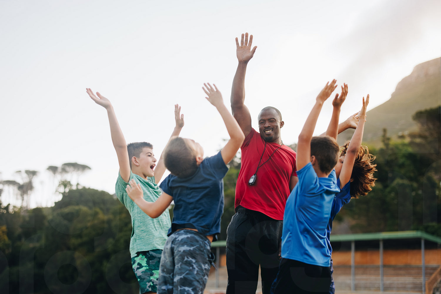 School coach and his team celebrating with raised arms in a field. Sports trainer having a practice session with his students. Man mentoring a group of primary school kids.