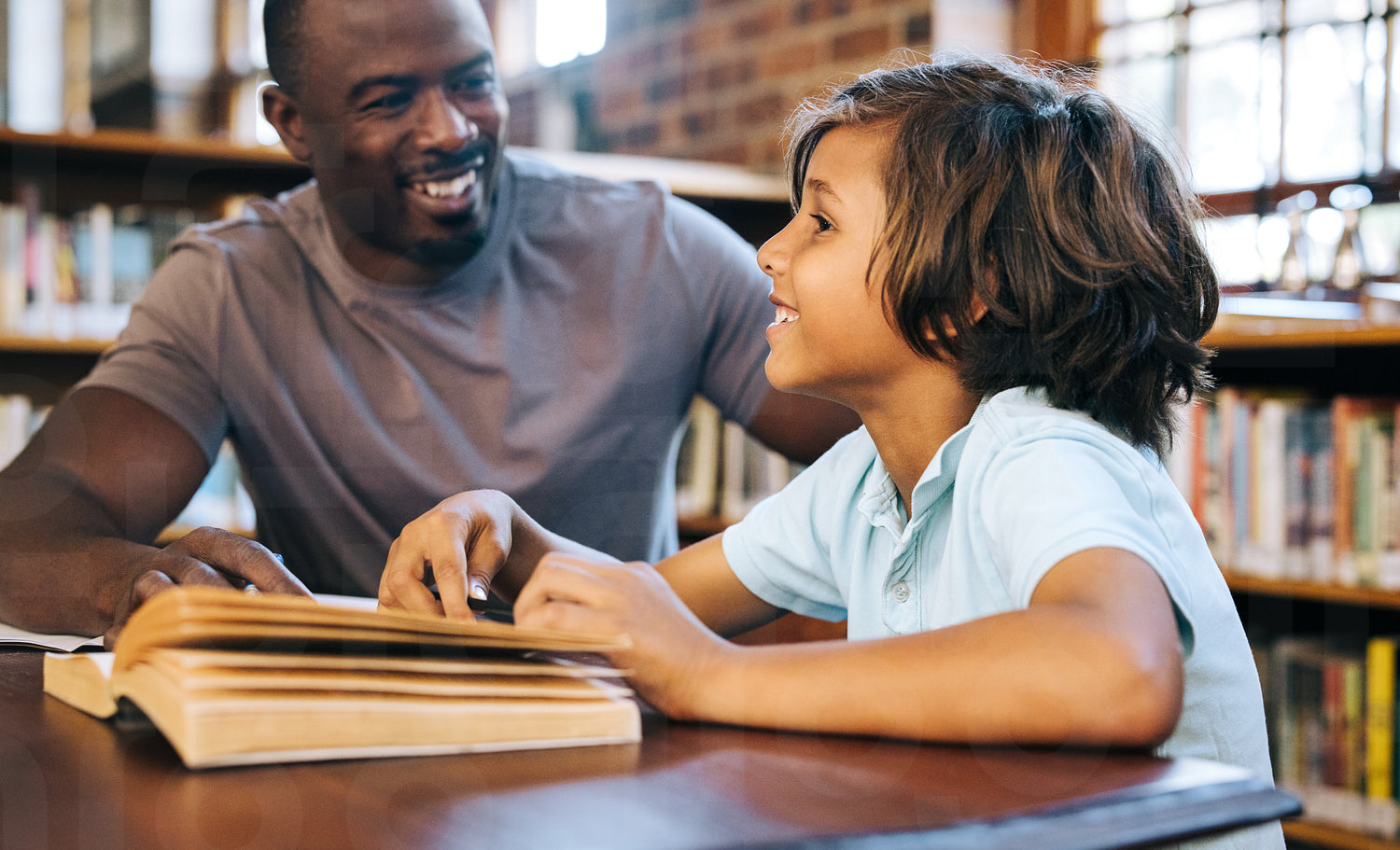 School teacher tutoring a young boy in a library. Male elementary teacher assisting a young student with his school work. Private reading and writing lesson in a primary school.