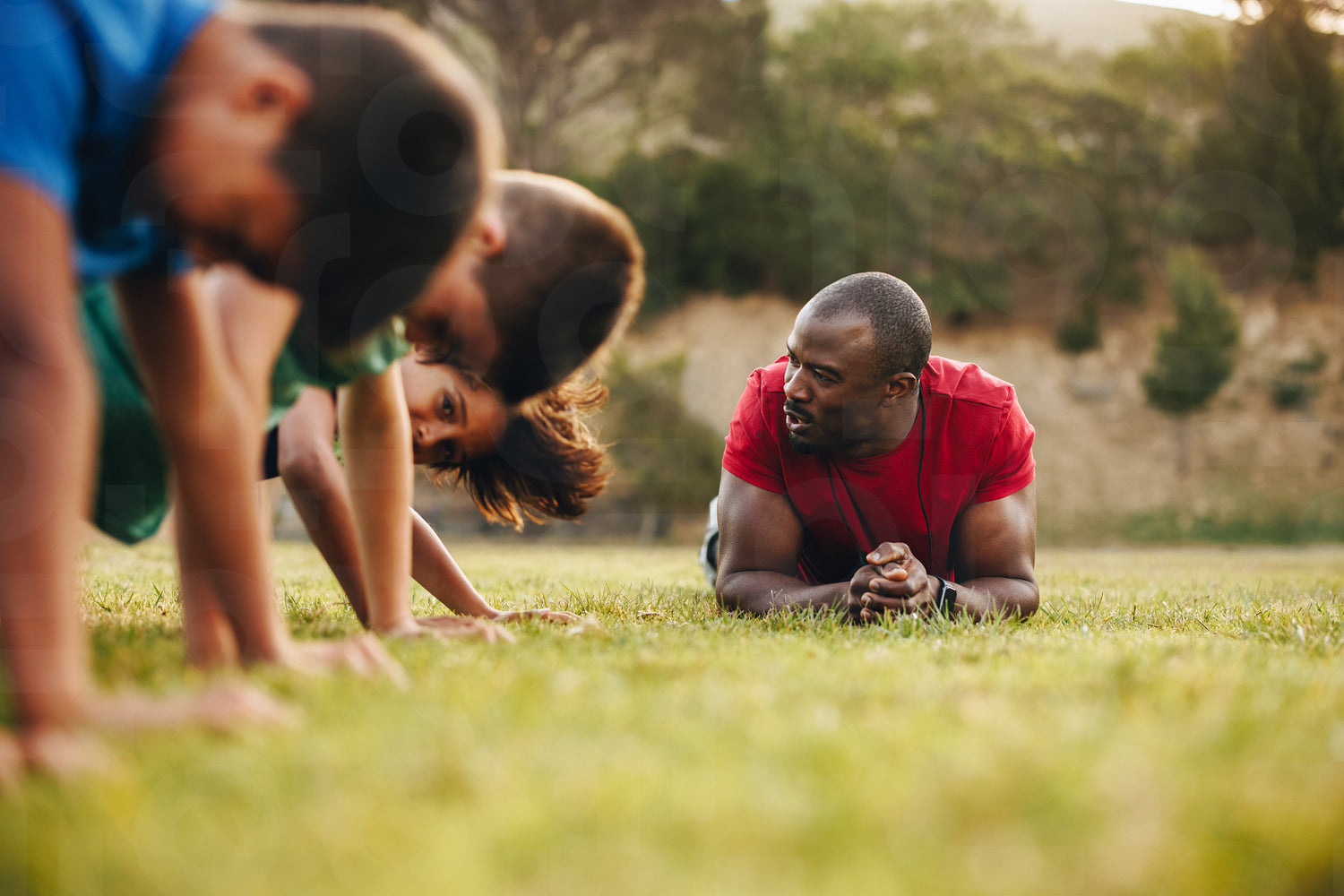 Sports coach training a school team in a rugby field