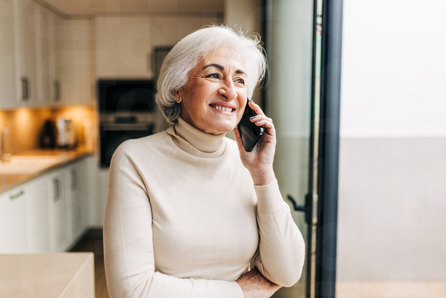 Silver-haired elderly woman smiling happily while speaking on a phone call. Retired senior woman communicating with her loved ones at home.