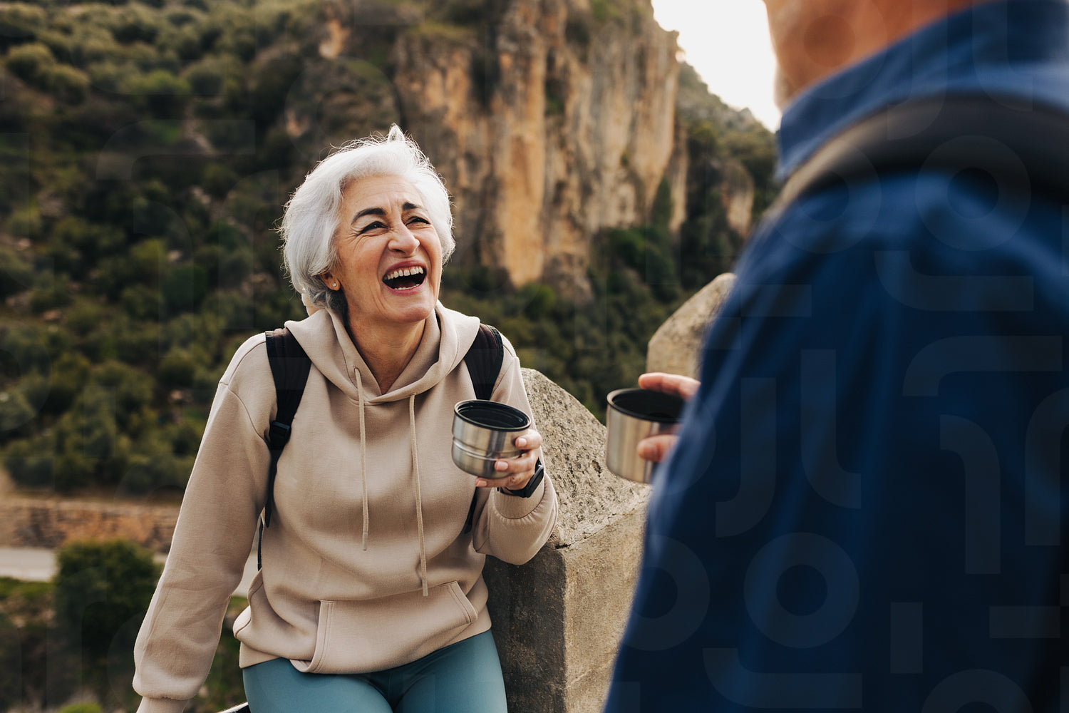 Joyful senior couple laughing together while taking a coffee break on a hilltop. Happy elderly couple enjoying a leisurely hike outdoors. Mature couple spending quality time together after retirement.