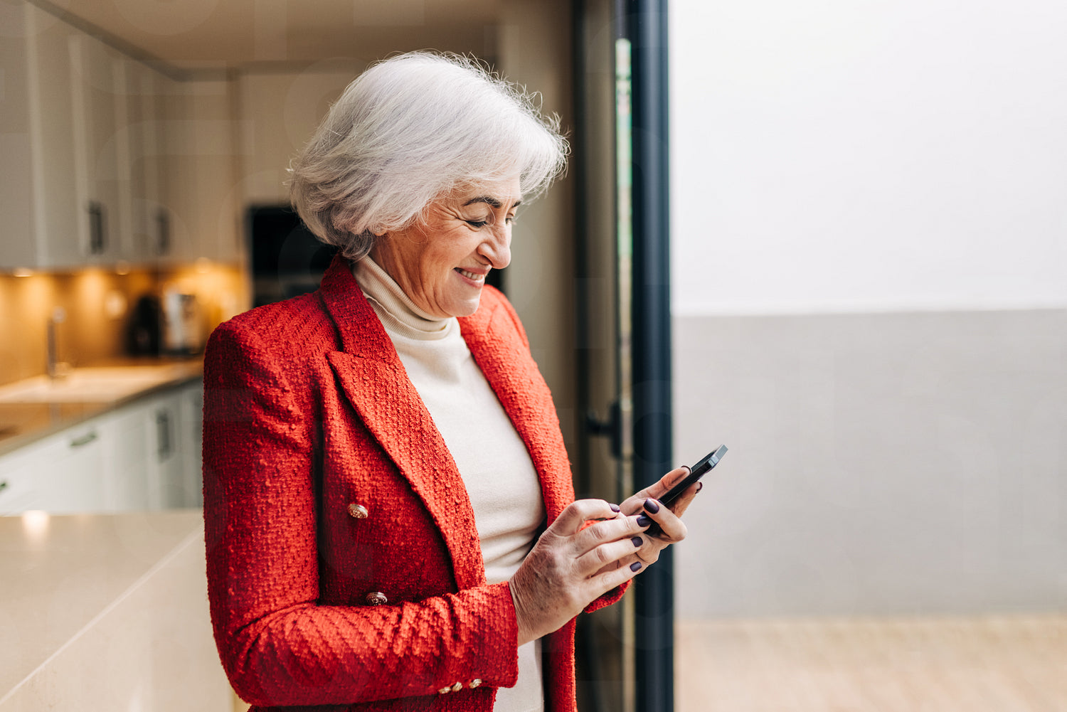 Mature businesswoman smiling happily while using a smartphone at home. Senior businesswoman sending a text message while working from home.