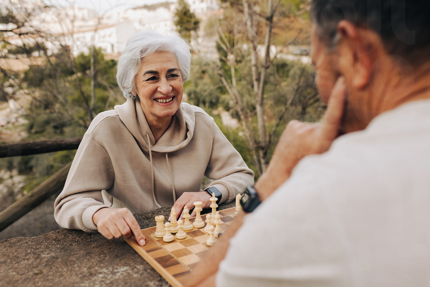 Retired couple playing a game of chess in a park. Cheerful senior couple spending quality time together after retirement. Happy elderly couple enjoying themselves outdoors.