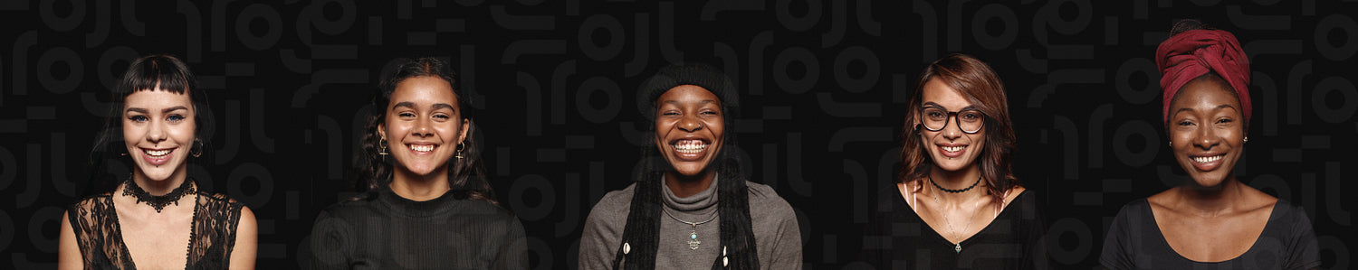 Group of multiethnic young women on black background. Wide angle close up shot of happy mixxed race women.