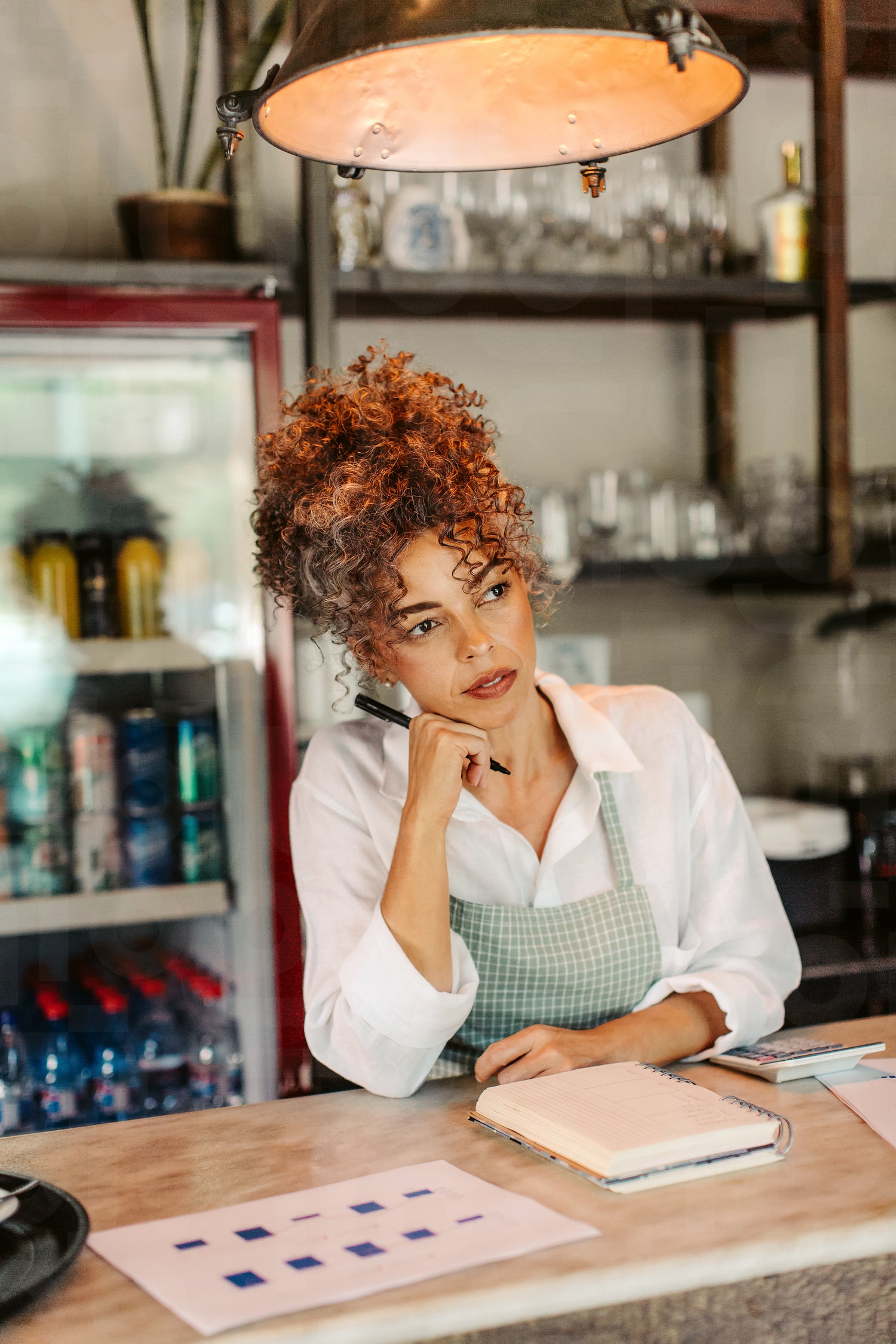 Coffee shop owner looking away thoughtfully while doing her budget in her cafe. Mature business owner calculating her monthly expenses. Businesswoman thinking of new ides for her new business.