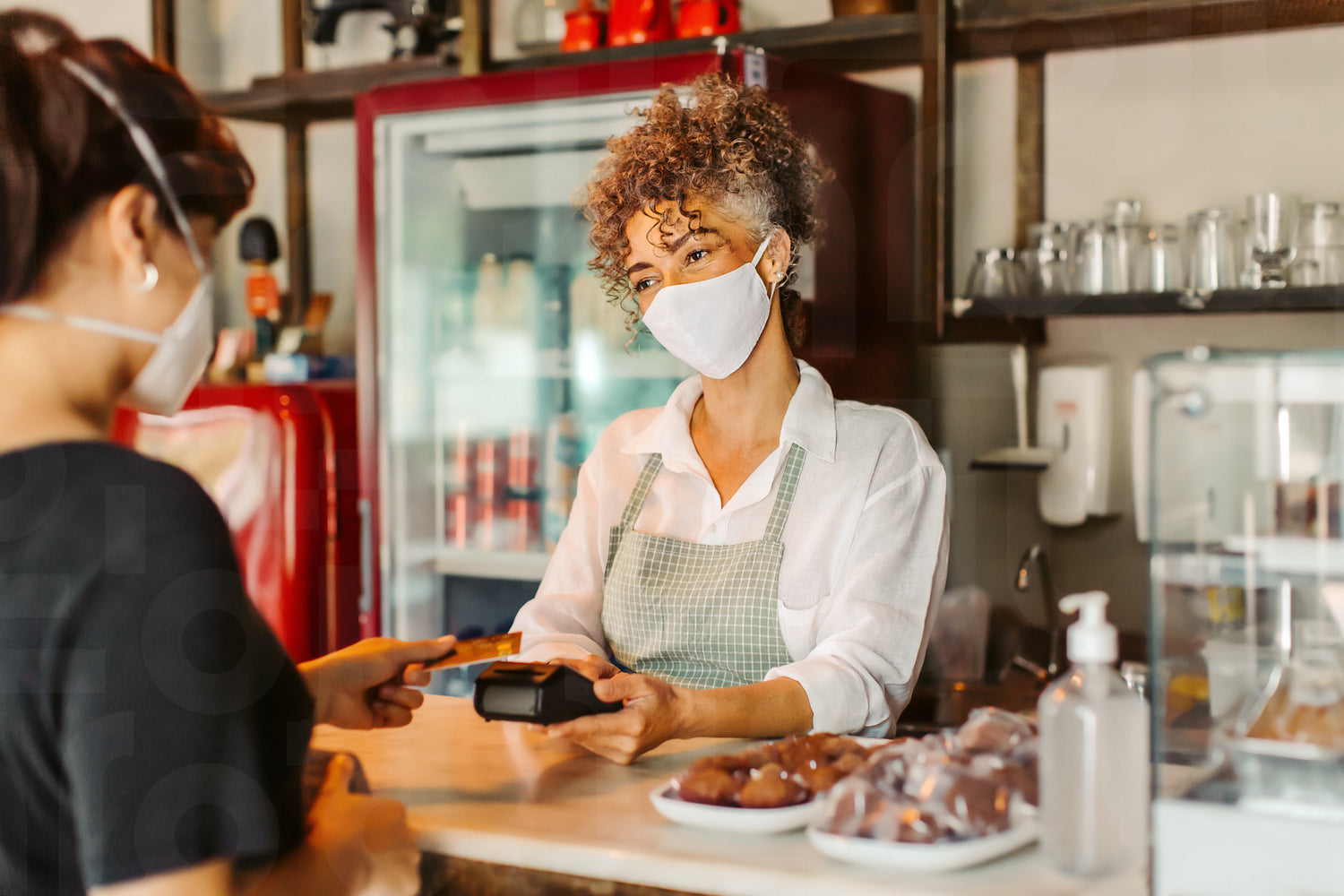 Female business owner in a face mask taking a card payment from a customer. Mature businesswoman serving a customer over the counter in her cafe. Customer service during the COVID-19 pandemic.