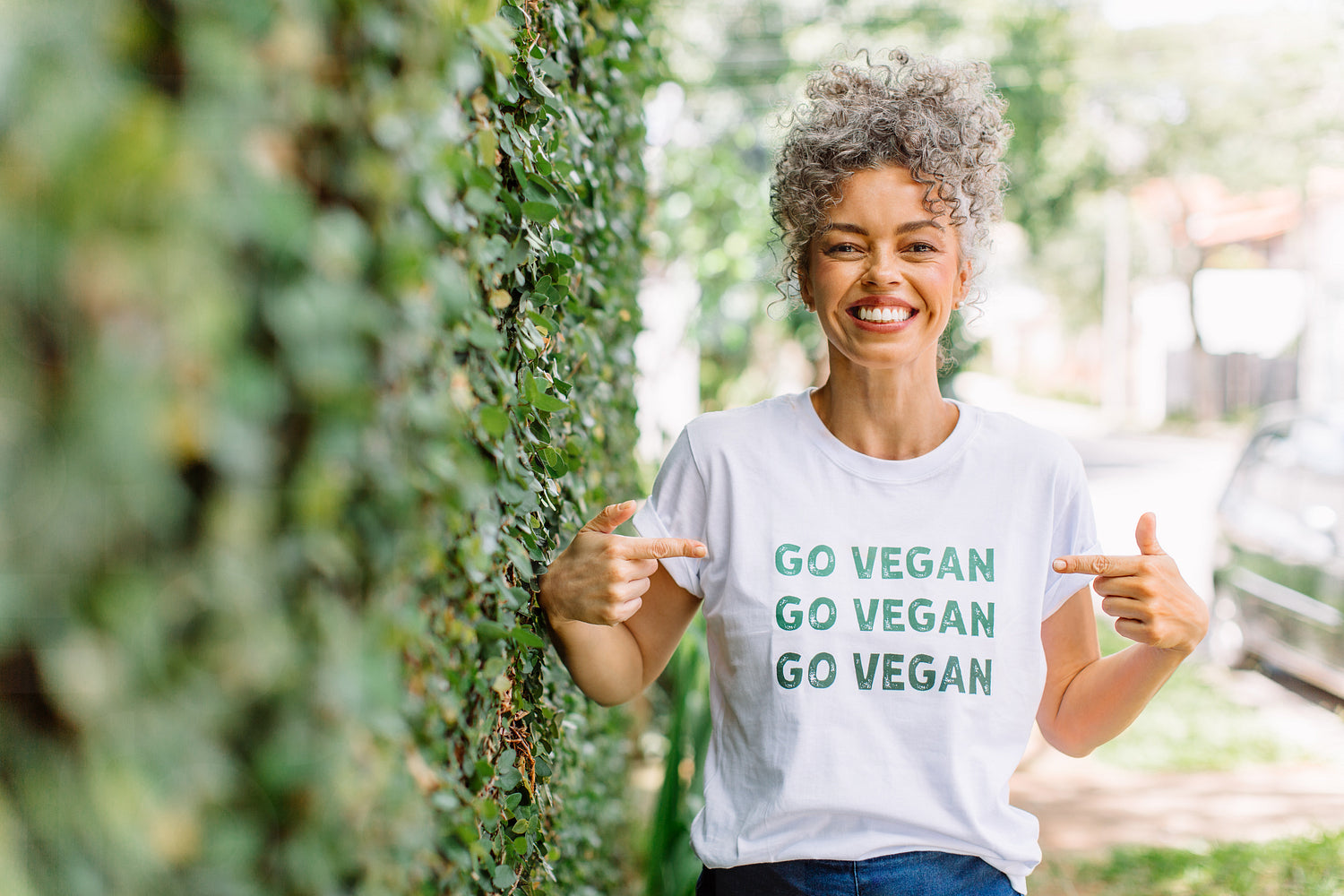 Happy mature vegan activist smiling cheerfully while standing alone outdoors. Cheerful mature woman advocating for veganism while wearing a shirt with the words "GO VEGAN" written on it.