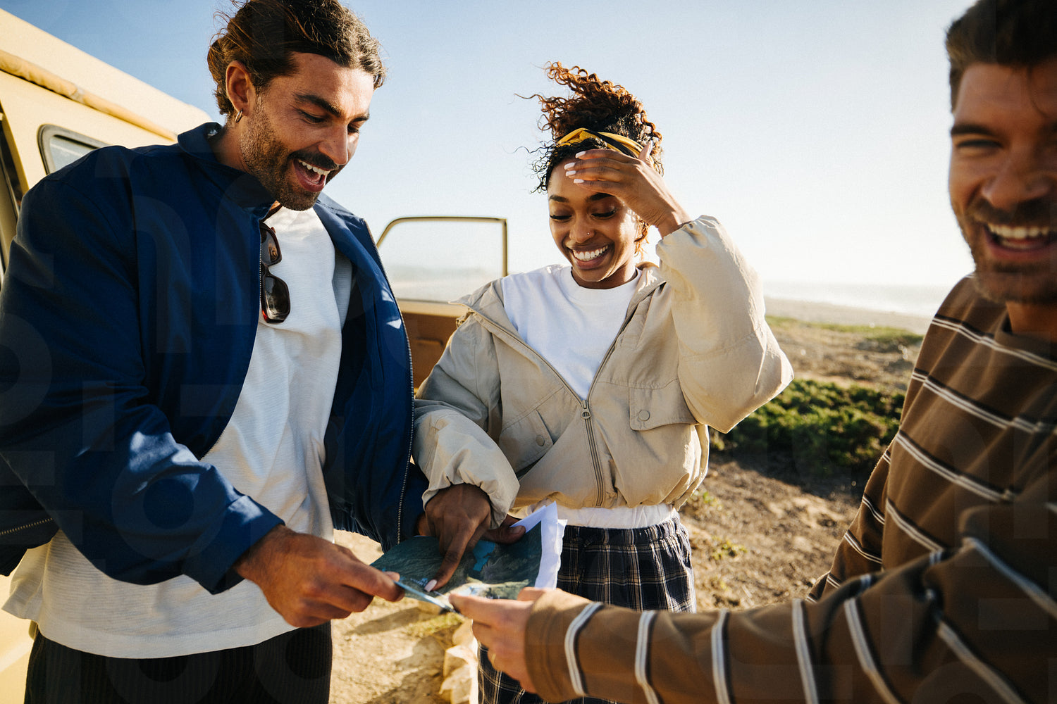 Three friends share a joyful moment outdoors as they plan a coastal road trip, inspecting a map beside a yellow van on a sunny beach, capturing friendship, adventure, and group exploration. This photo has intentional use of 35mm film grain.