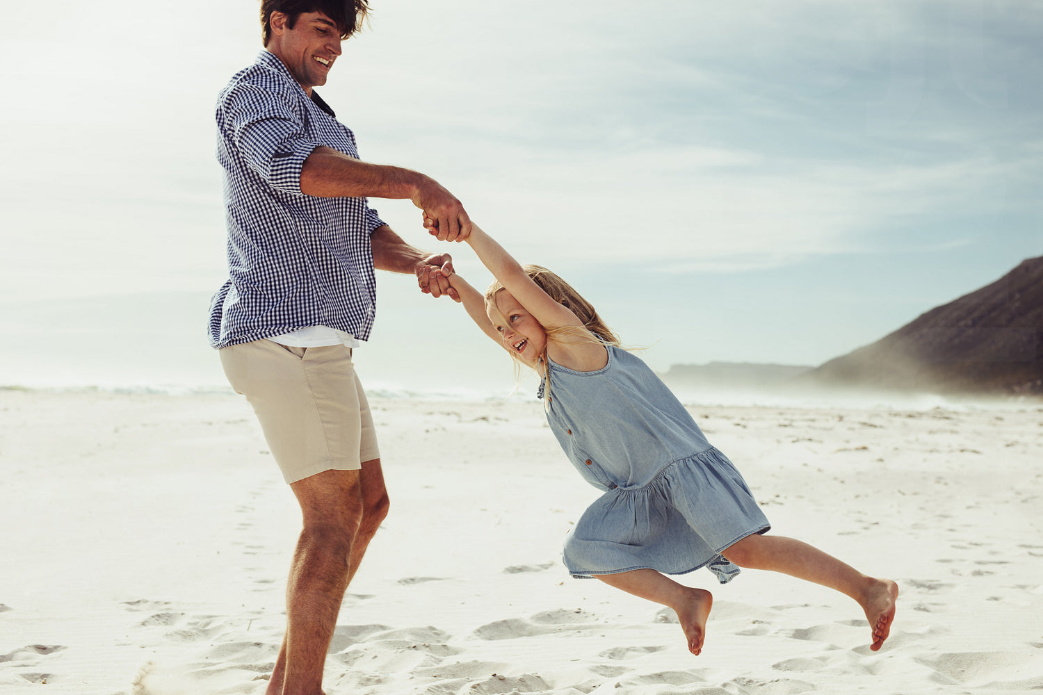 Happy father swinging his daughter around on the beach. Man playing with his daughter on beach vacation.