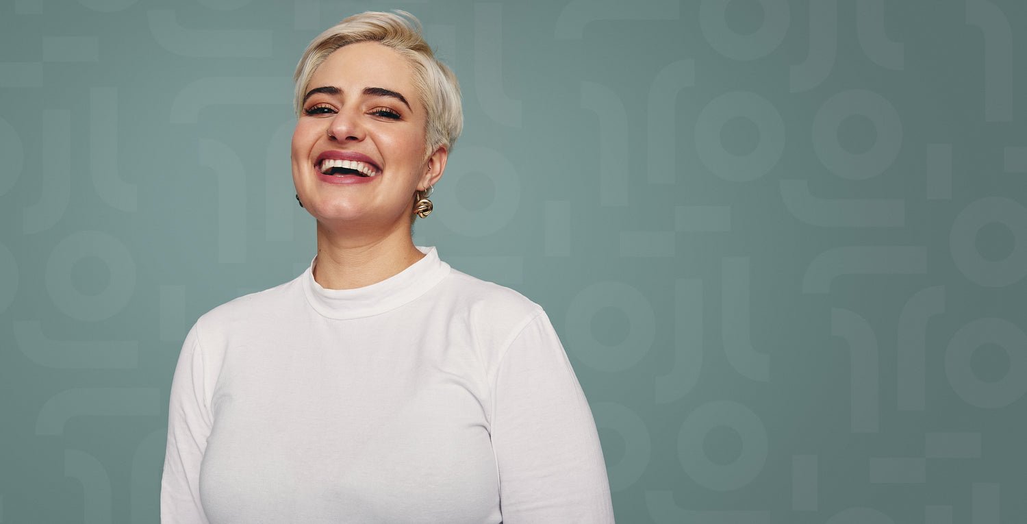 Smiling blonde woman standing in a studio