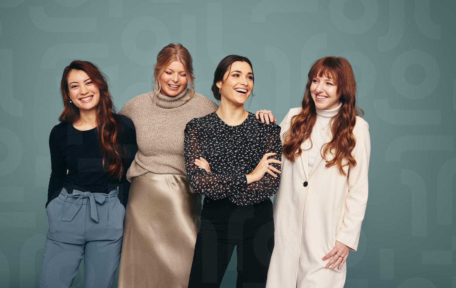 Cheerful group of women smiling happily in a studio. Four independent women embracing each other while standing together against a studio background. Women of different ages embracing empowerment.