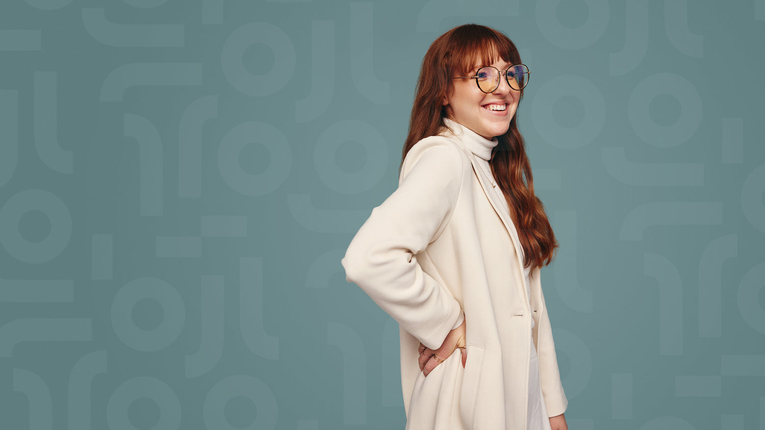 Cute young woman with glasses smiling in a studio. Strong independent young woman looking away while standing against a studio background. Confident young woman embracing girl power.