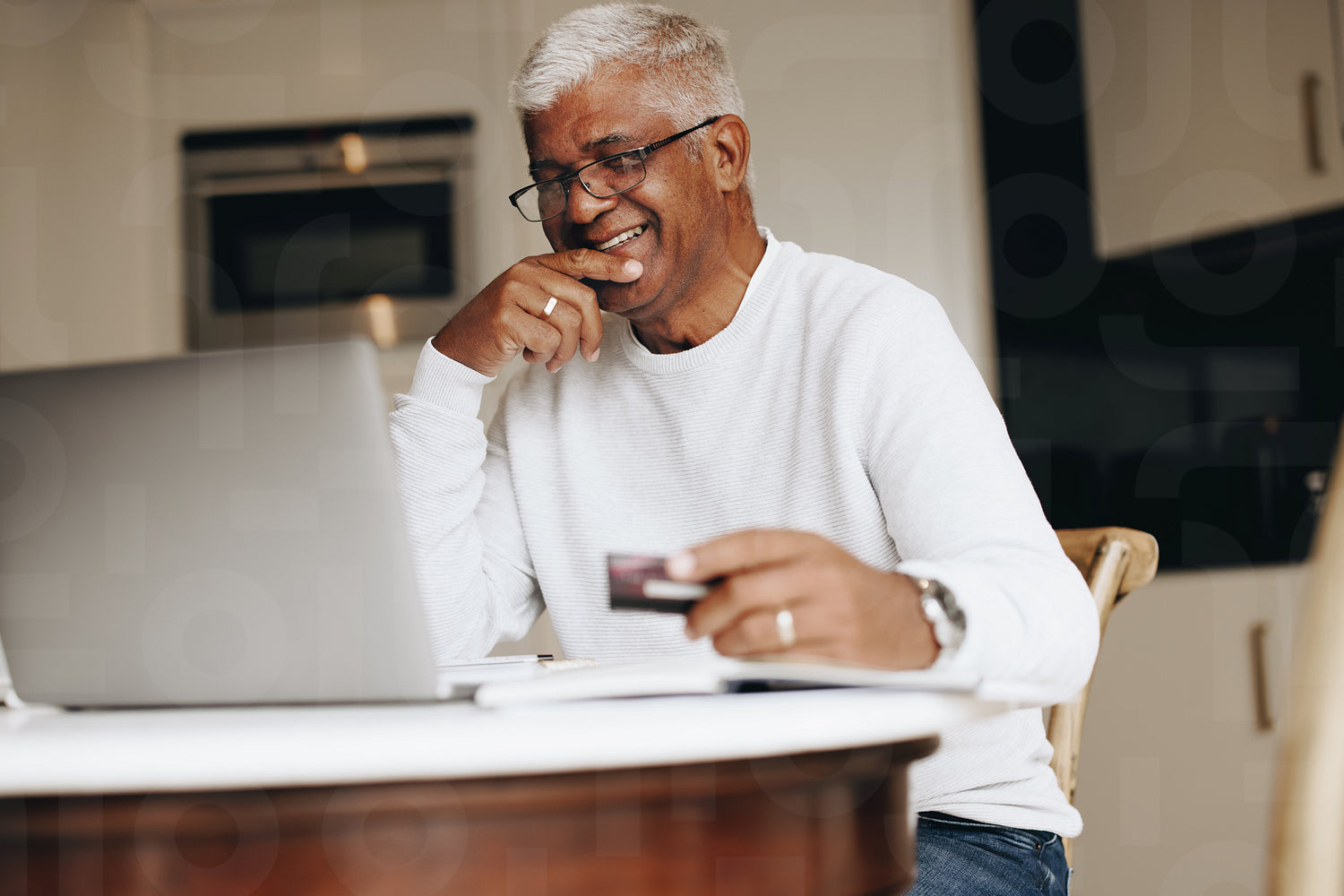 Carefree senior man smiling cheerfully while shopping online at home. Happy mature man using his credit card to place an online order on a laptop. Pensioner spoiling himself after retirement.