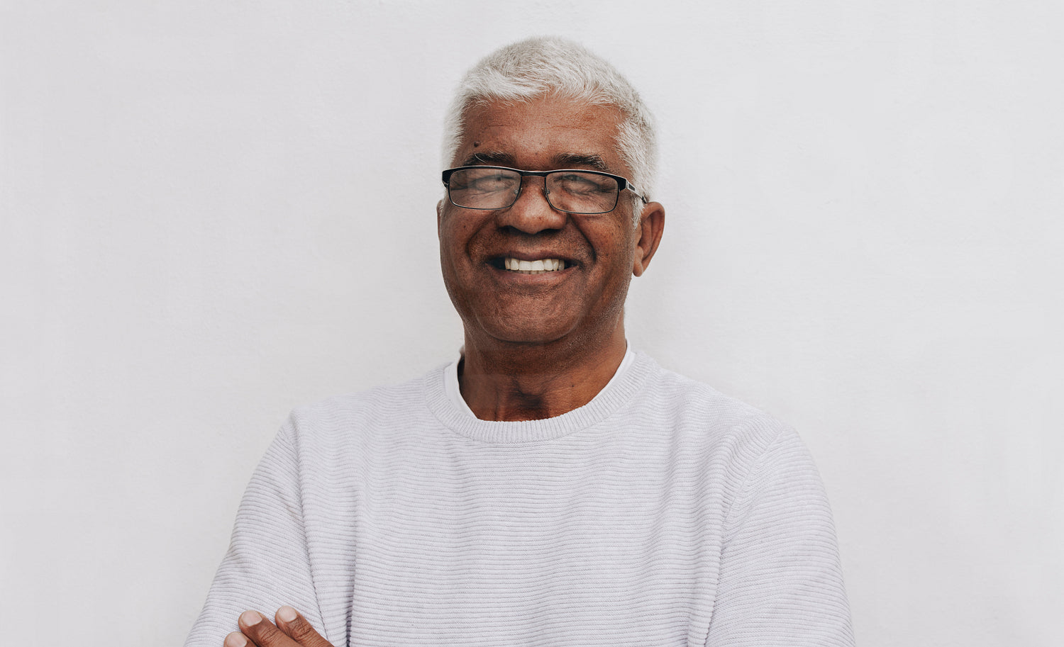 Happy senior man smiling at the camera while standing against a white background. Portrait of a cheerful mature man wearing eyeglasses.