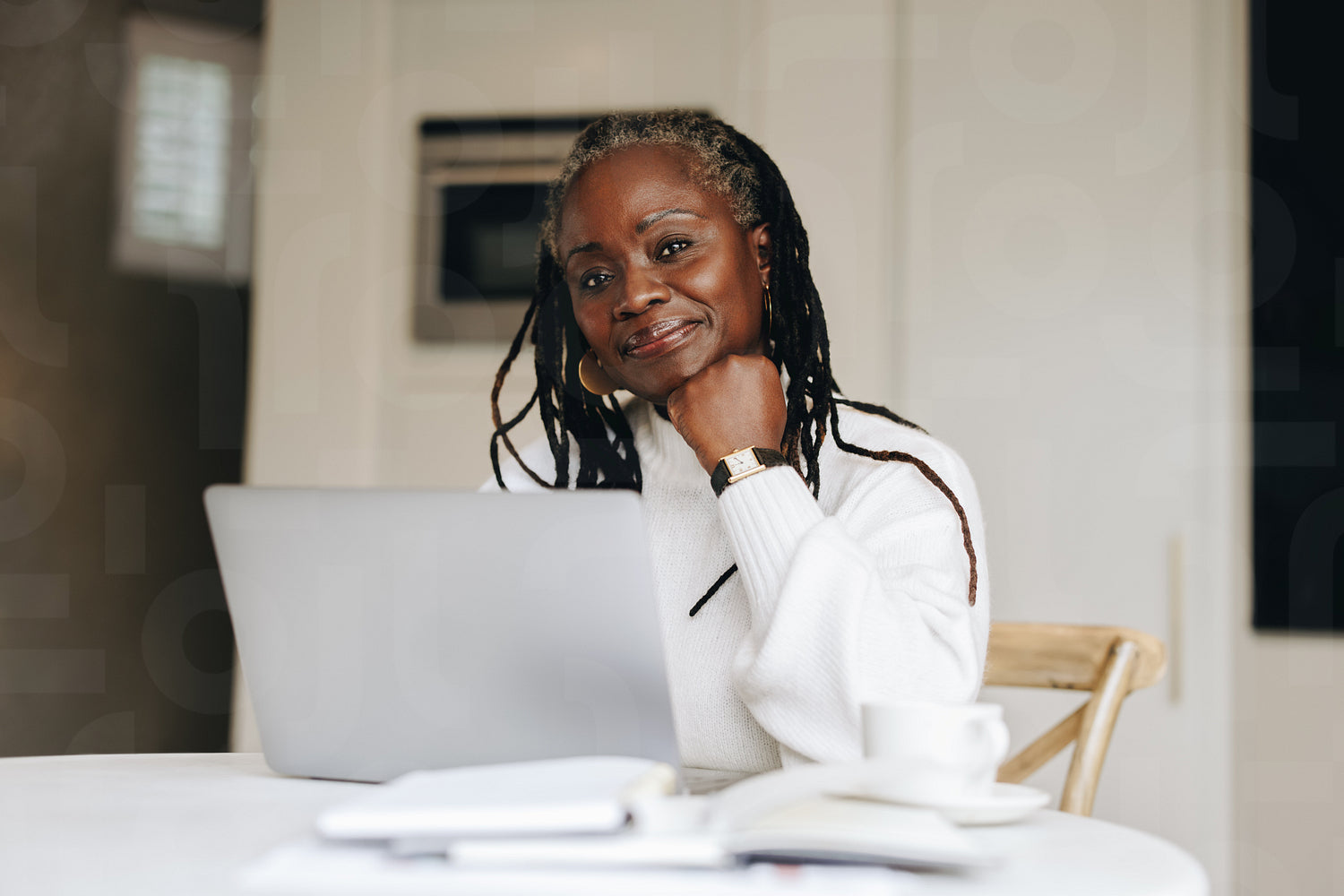 Senior businesswoman looking at the camera while working on a laptop at home. Mature businesswoman doing online freelance work in her home office.