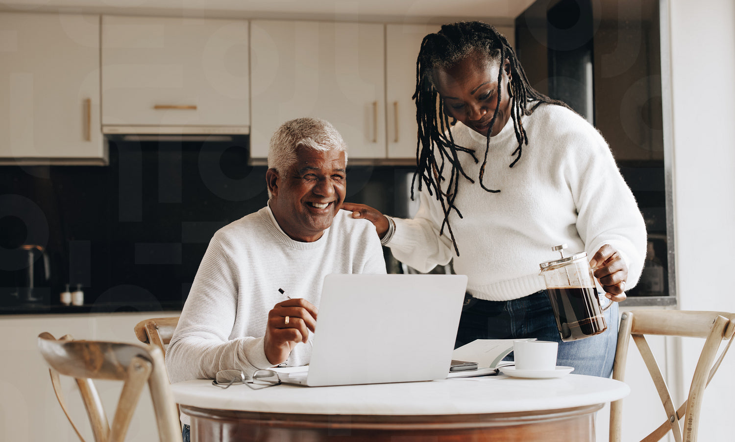 Supportive woman pouring her husband a cup of coffee in his home office. Happy mature woman encouraging her husband while he's working from home.