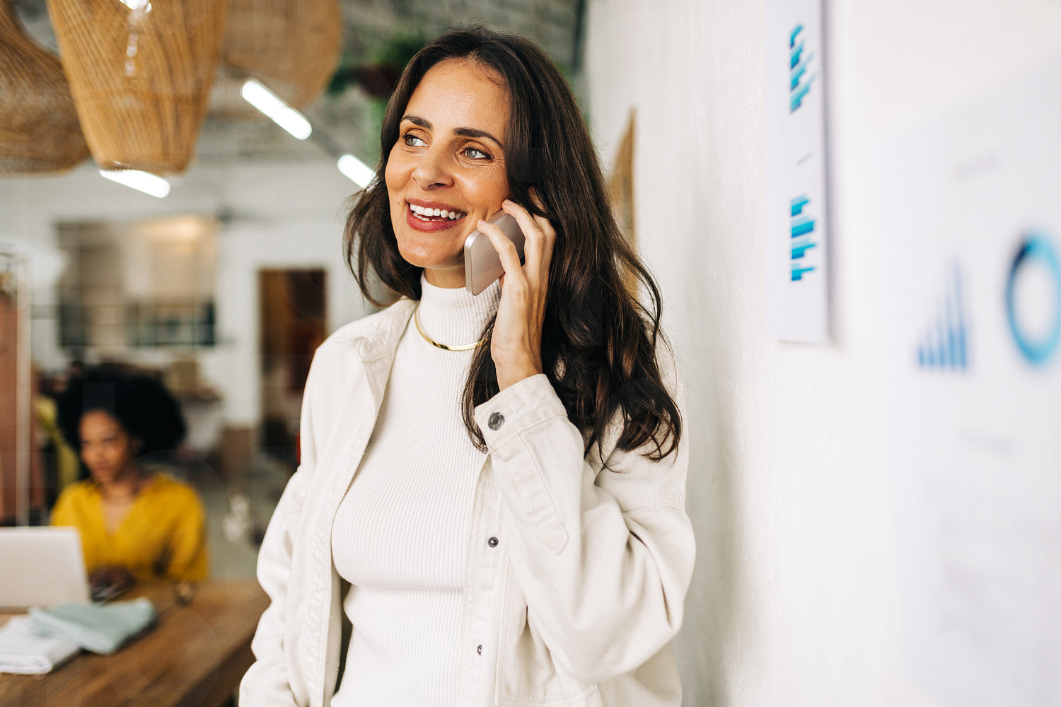 Fashion designer speaking on a phone call in an office, reaching out to her business associates and clients to discuss plans for collaboration. Woman working in a creative, female-led small business.