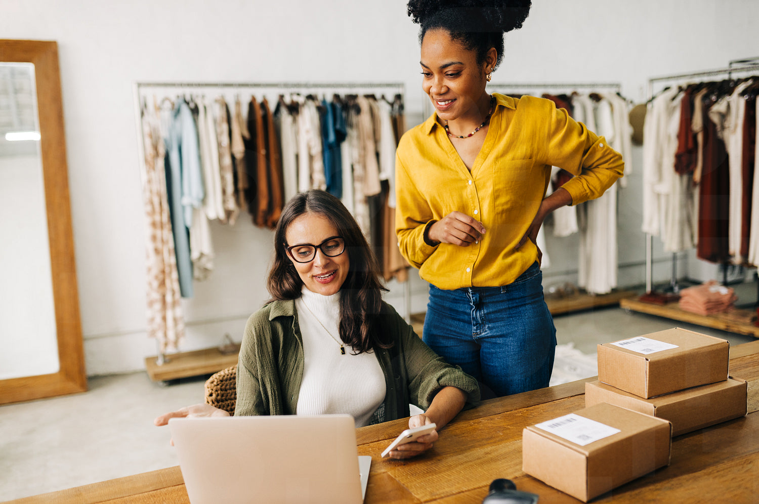 Women using a laptop to discuss the numbers and progress on their ecommerce website. Two female entrepreneurs managing a successful clothing online store that fulfils orders using dropshipping