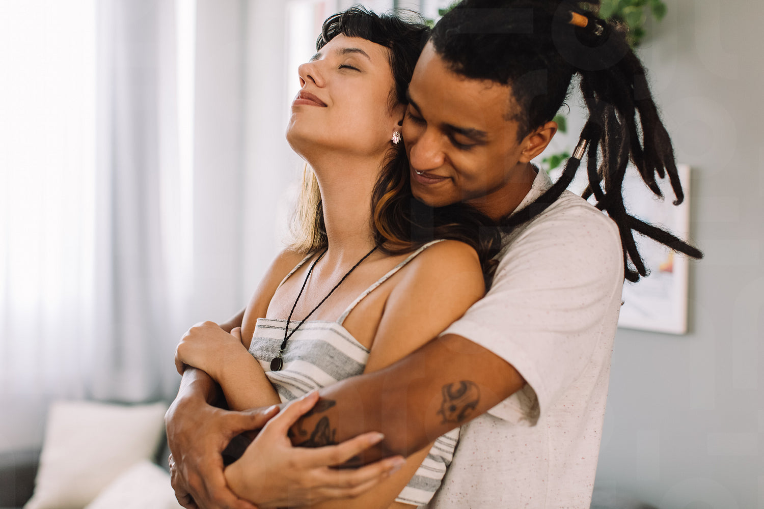 Two affectionate young lovers bonding fondly at home. Romantic young couple embracing each other warmly while standing in their living room during the day.
