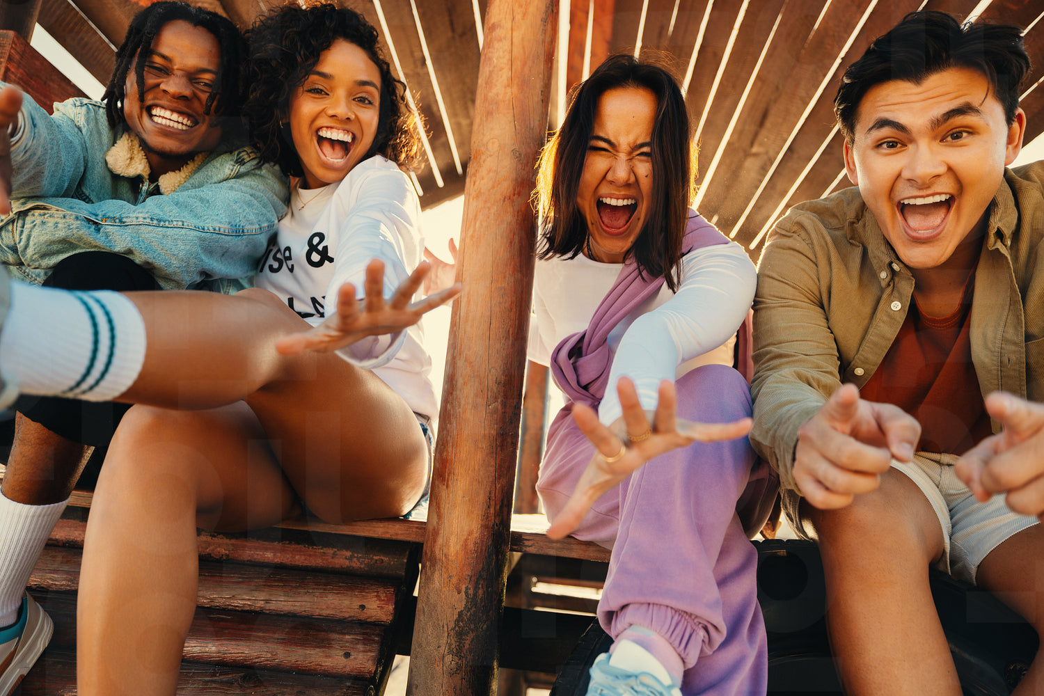 Group of four joyful friends having fun and laughing together outside. Capturing the essence of friendship, happiness, and unity.
