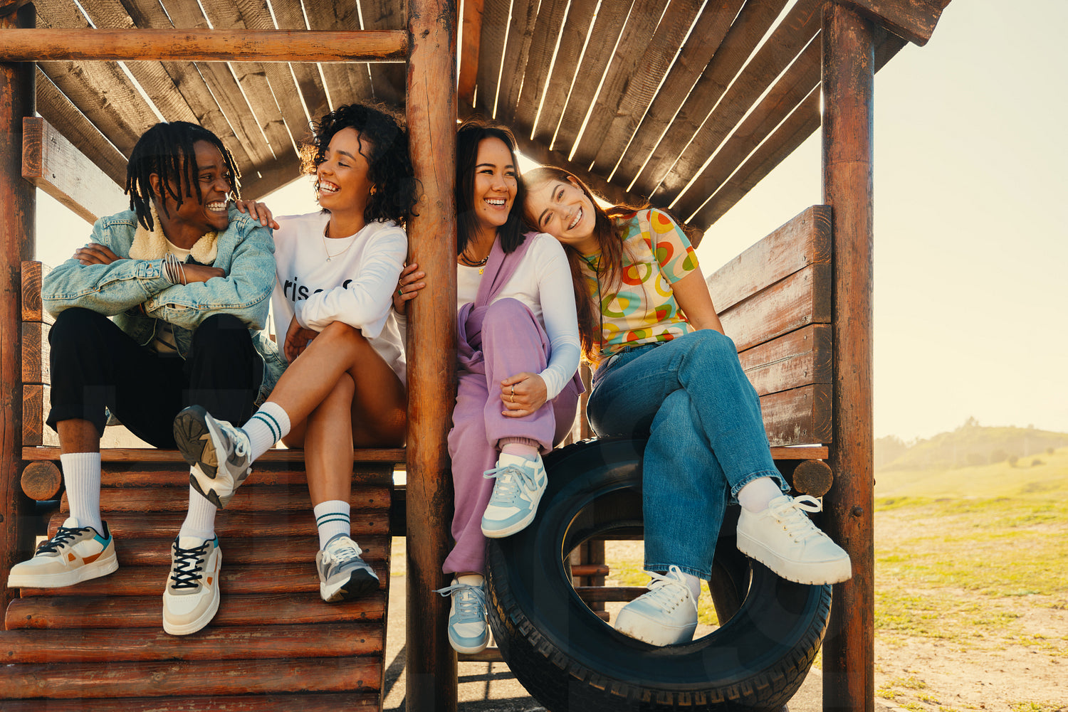A joyful group of diverse friends smiling and enjoying time together outdoors, showcasing camaraderie and happiness.