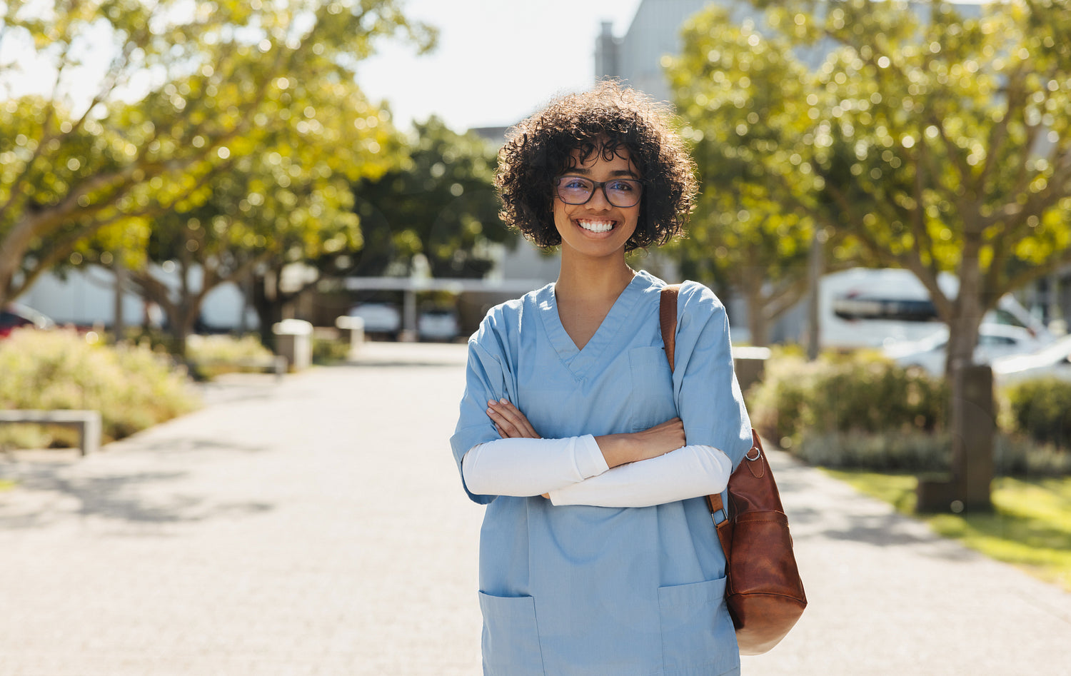 Aspiring doctor, a young woman in medical school, looks at the camera with a confident smile as she stands on campus dressed in scrubs. Smart young woman studying medicine at university.