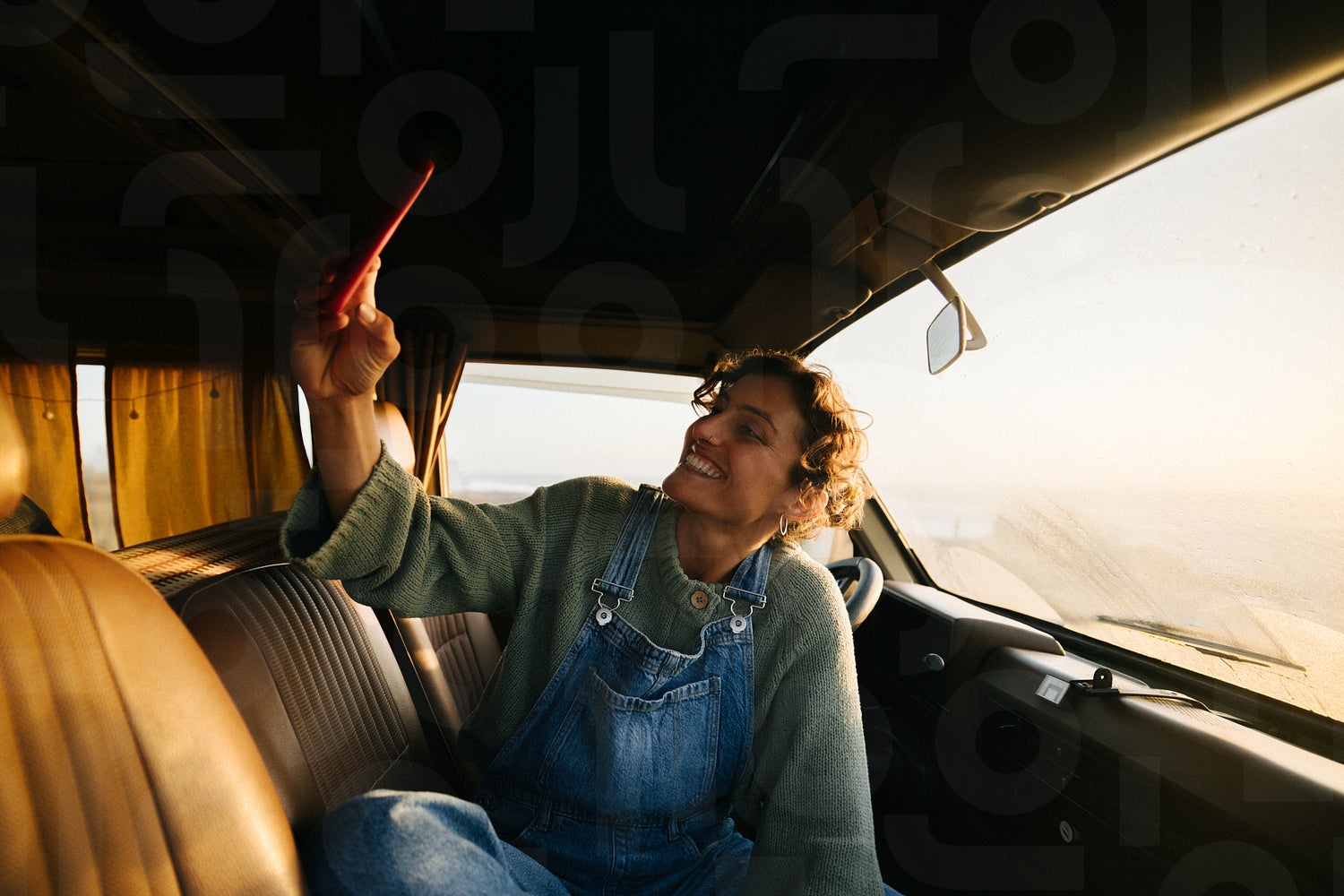 Bright moment inside a sunlit van as a woman in denim overalls points a phone for a selfie exuding warmth joy and a casual travel vibe. This photo has intentional use of 35mm film grain.