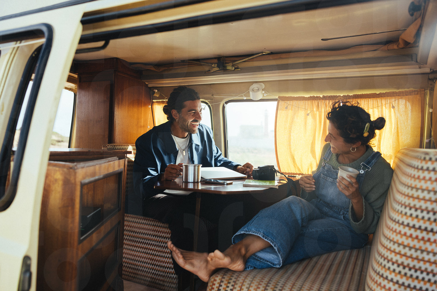 Couple enjoying coffee and conversation in a cozy camper van during a road trip