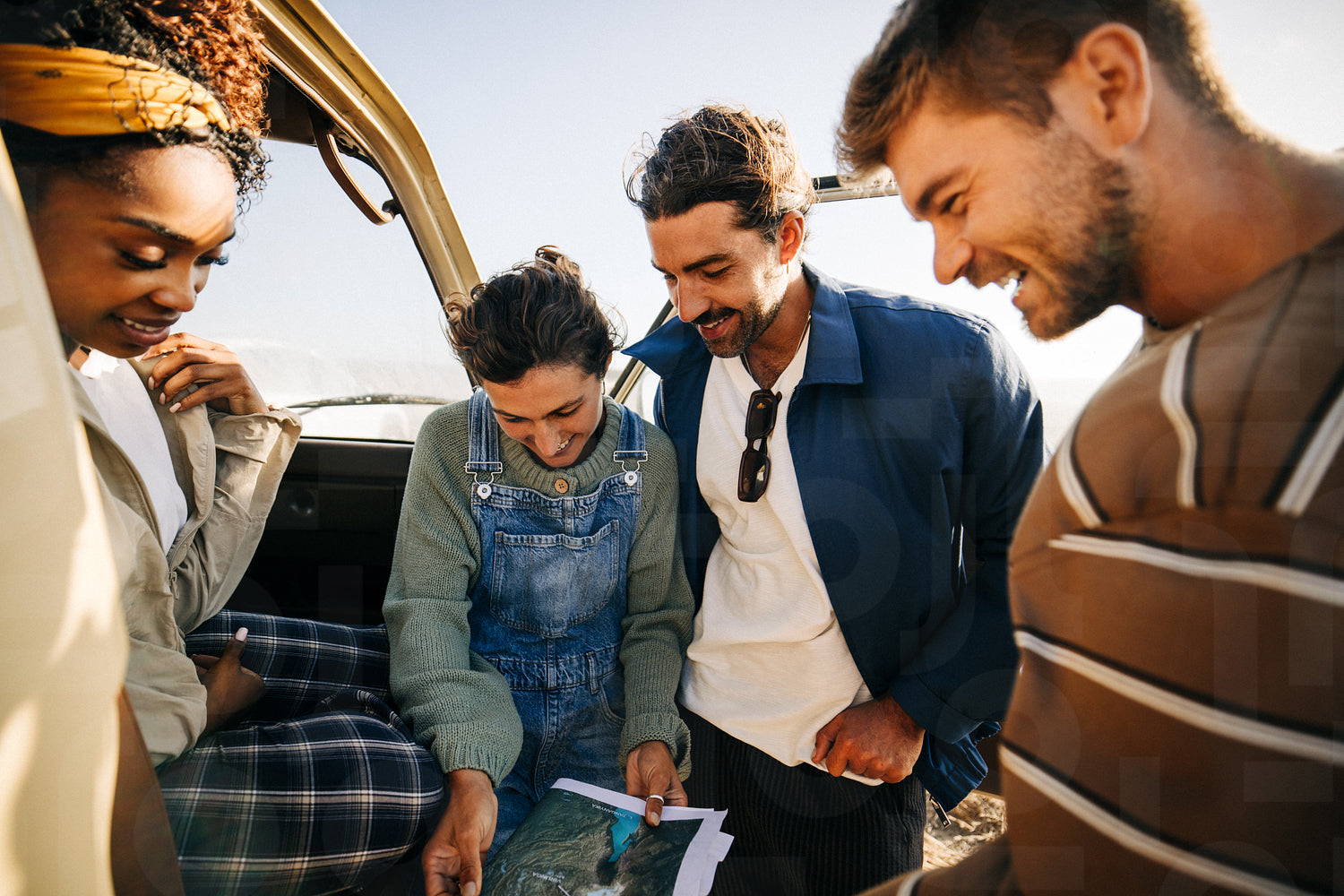 Three friends lean in over a paper map at the van door, comparing notes and pointing out landmarks as they decide where the next stretch of their road trip will take them across the open landscape. This photo has intentional use of 35mm film grain.