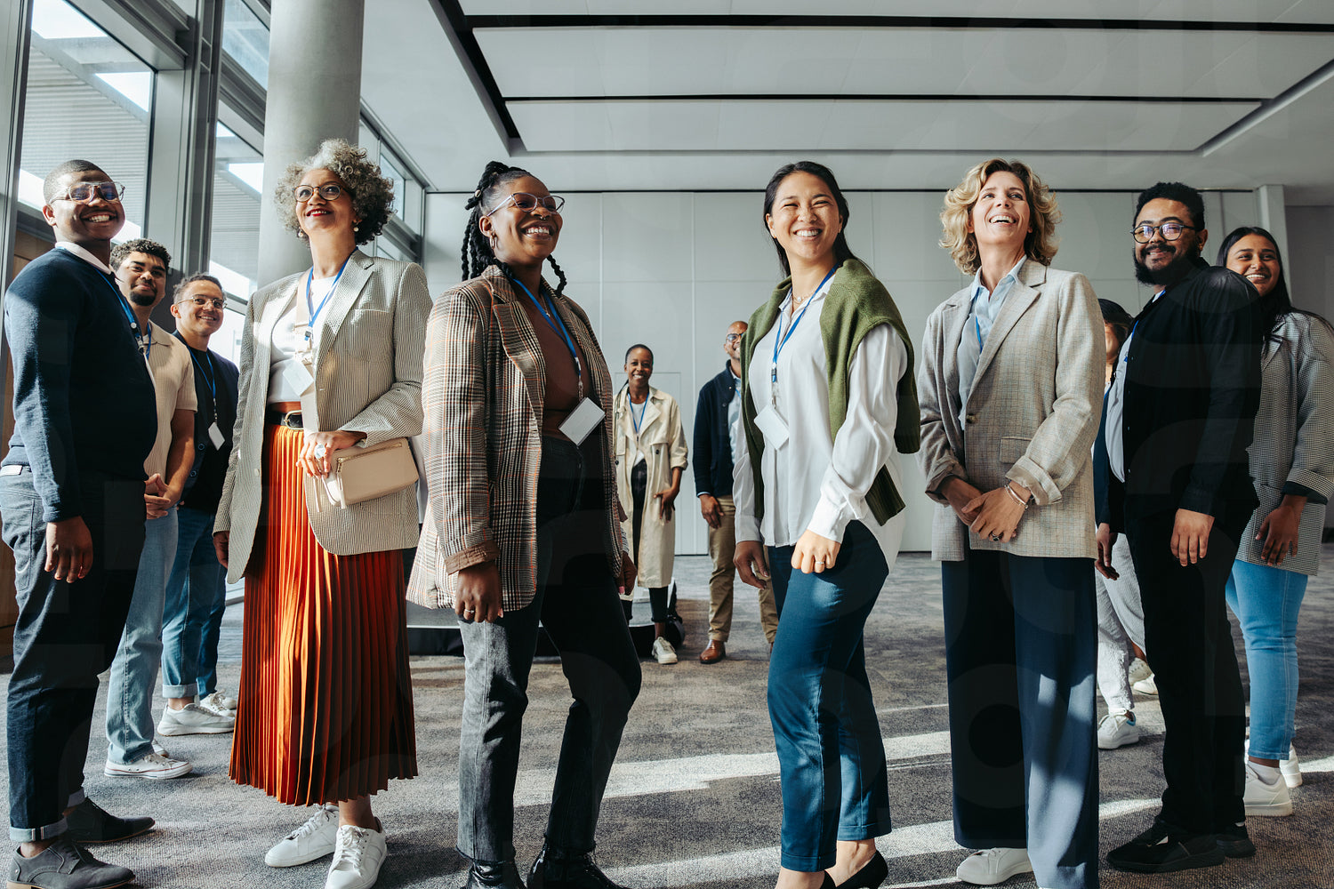 Confident group of professionals gathers at a seminar, radiating positivity and diversity in a modern conference environment.