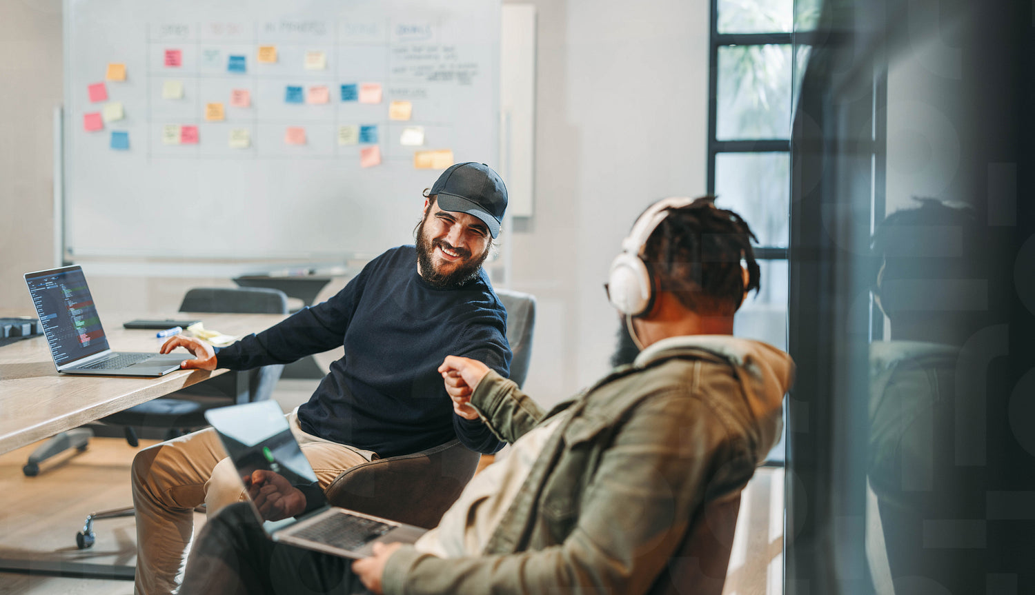 Two men celebrating their successful ideas. Coding and programming together, smiling and working on software development. A happy, creative team in a tech startup, achieving success through teamwork.