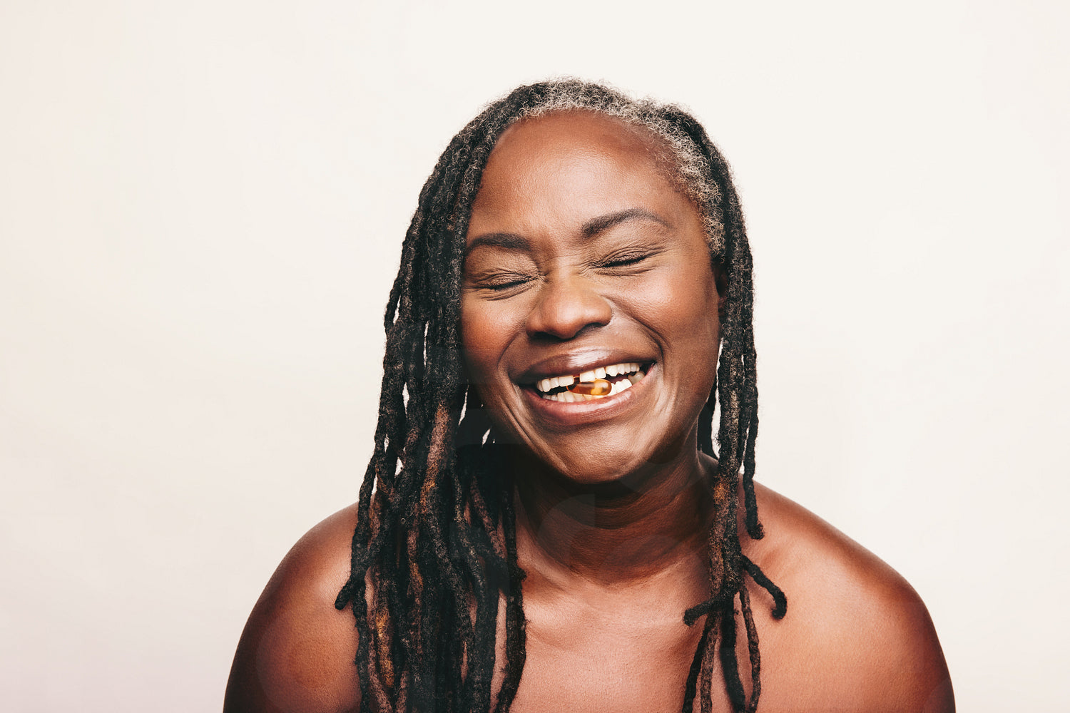 Cheerful woman smiling happily with a capsule of Omega 3 fatty acids between her teeth. Mature woman with dreadlocks using nutritional supplements as part of a healthy self-care routine.