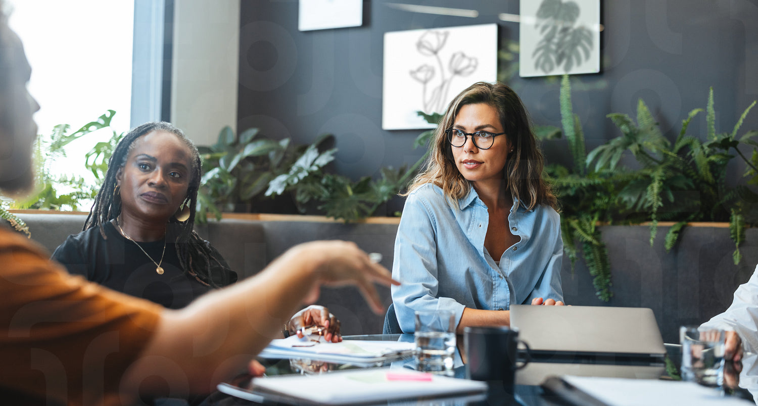 Group of multicultural business people sitting together around a conference table, discussing ideas and solutions for a project. Business professionals having a meeting in a modern workplace.