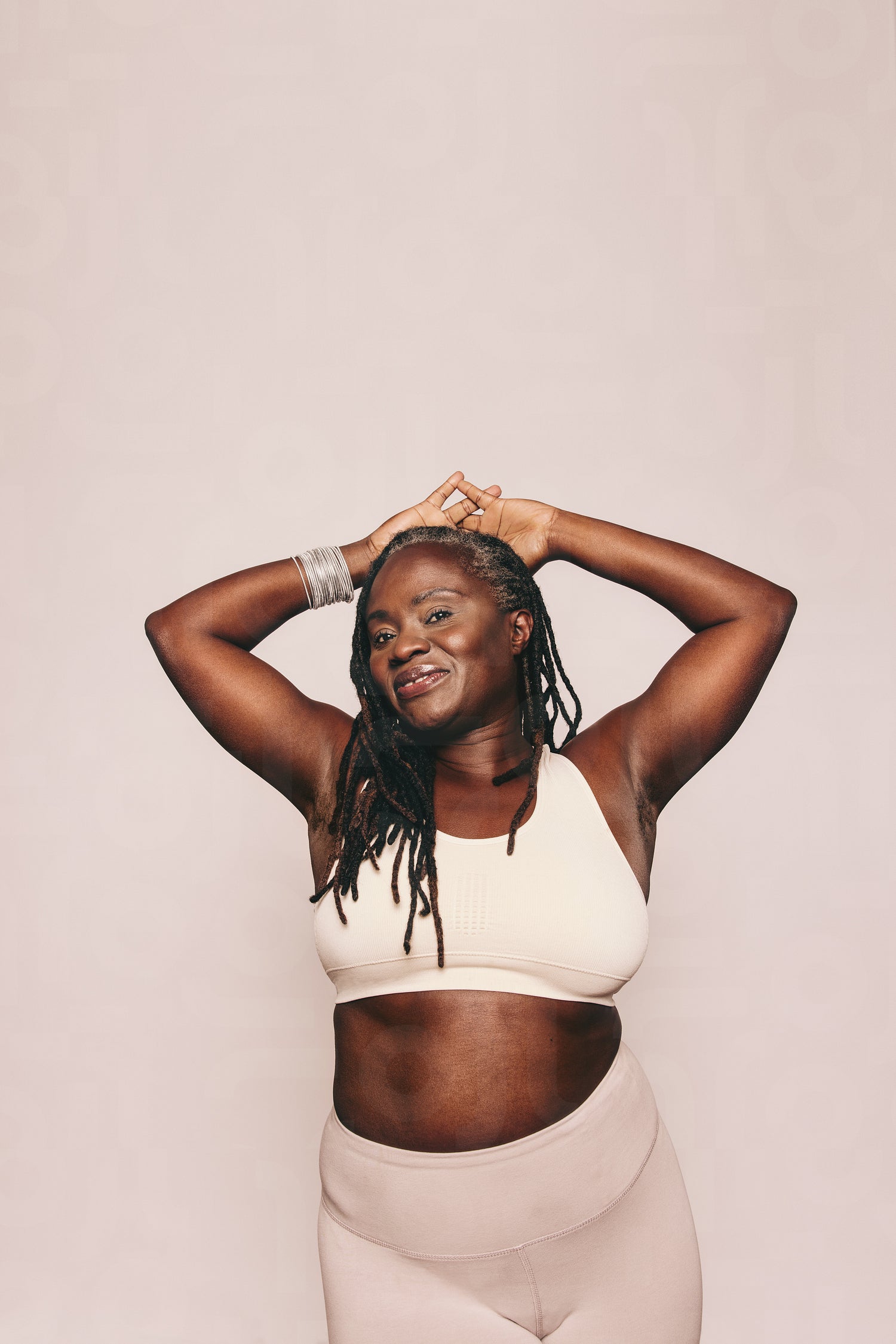 Sporty woman looking at the camera while standing against a grey background. Mature woman with dreadlocks wearing sports clothing in a studio. Middle-aged black woman maintaining a fit lifestyle.