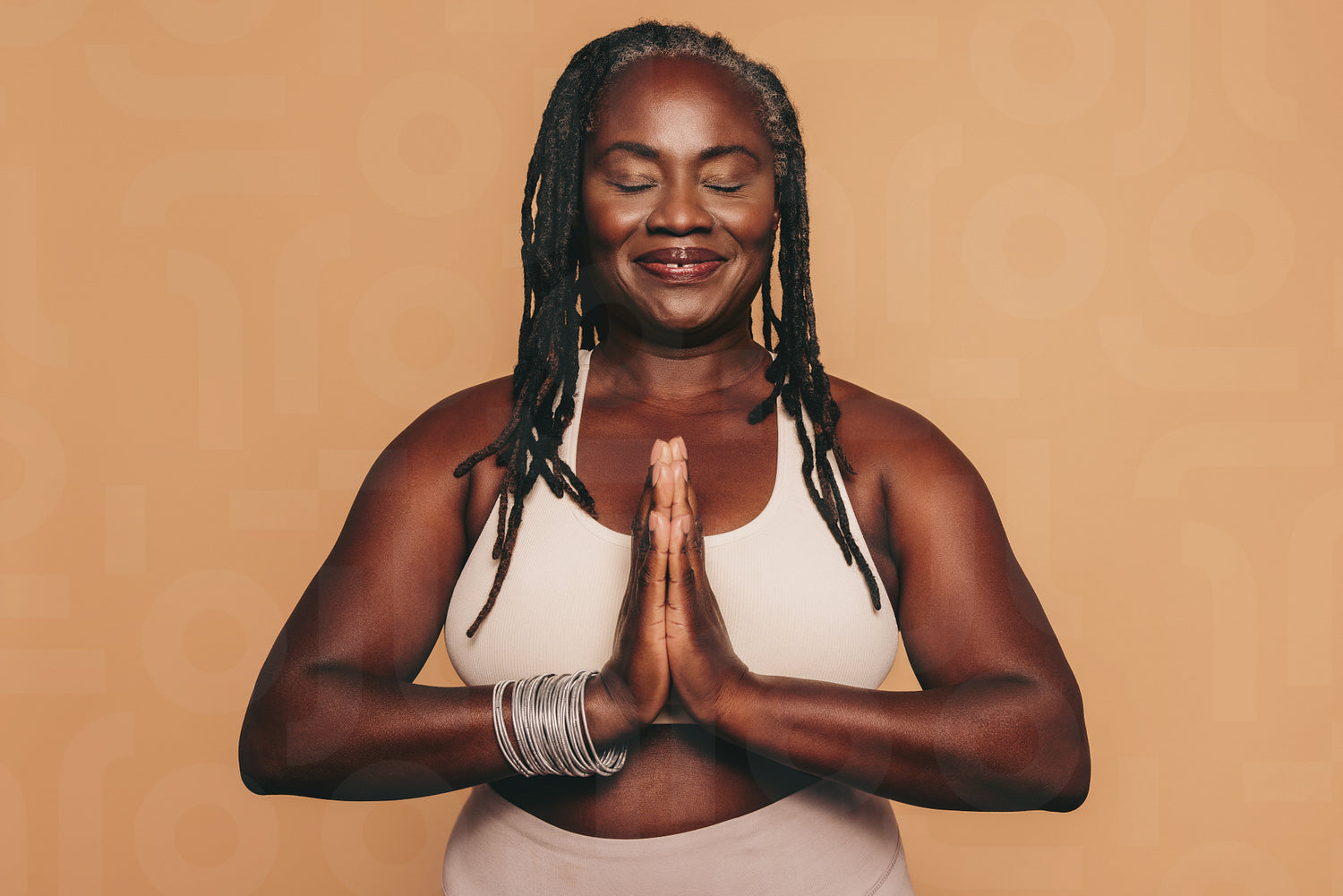 Mature woman meditating with her eyes closed and her hands in prayer position. Black woman with dreadlocks practicing yoga in a studio. Happy middle-aged woman maintaining a healthy lifestyle.