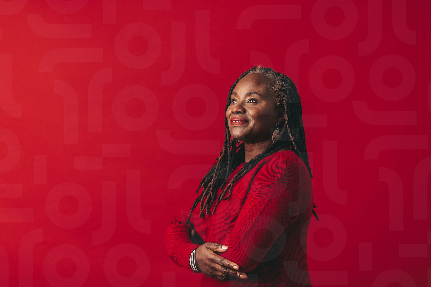 Pensive woman with dreadlocks looking away while standing against a red background. Mature black woman embracing her natural hair with confidence.