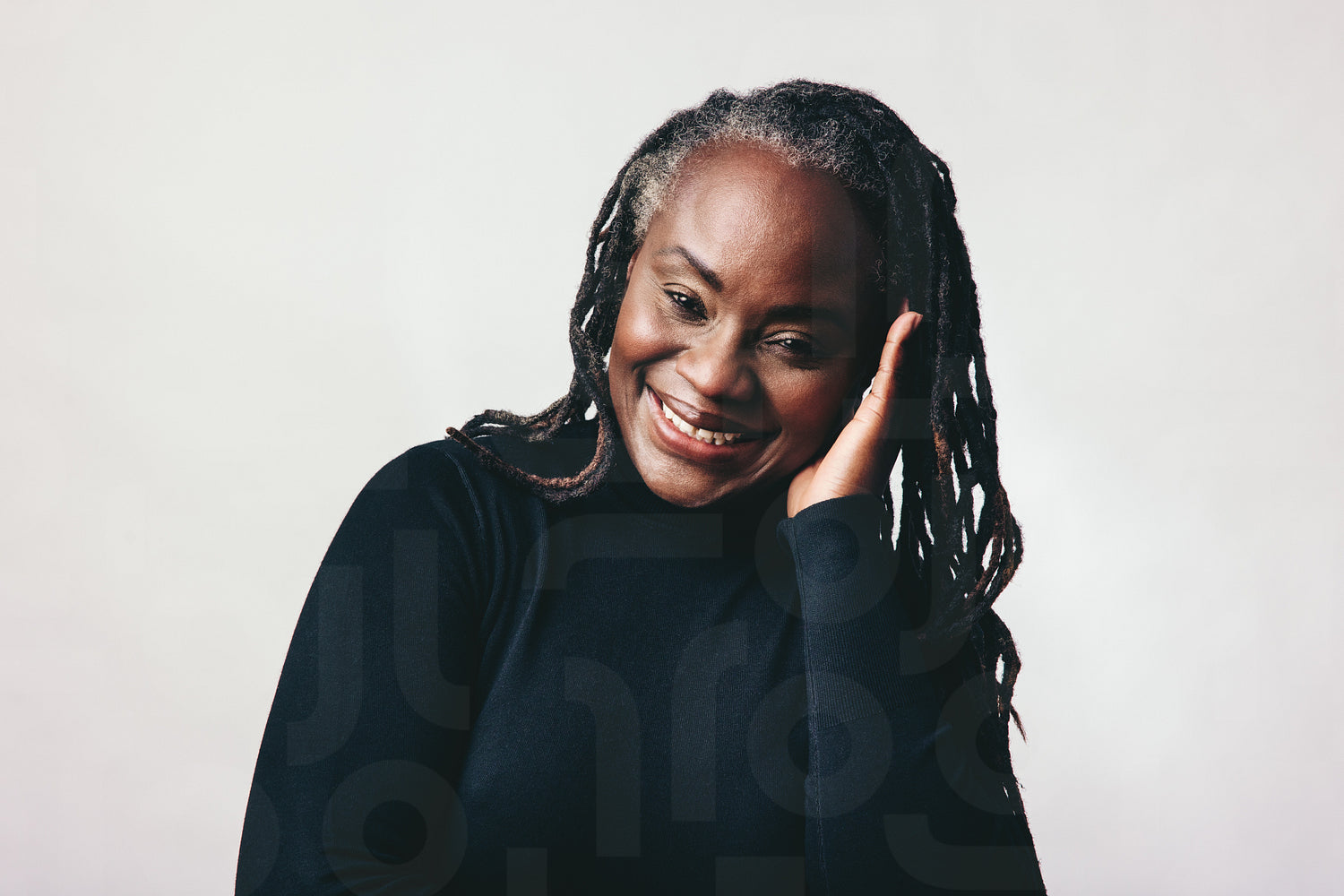 Self-confident mature woman smiling at the camera while touching her dreadlocks. Cheerful middle-aged woman embracing her natural hair with pride. Happy black woman standing against a grey background.
