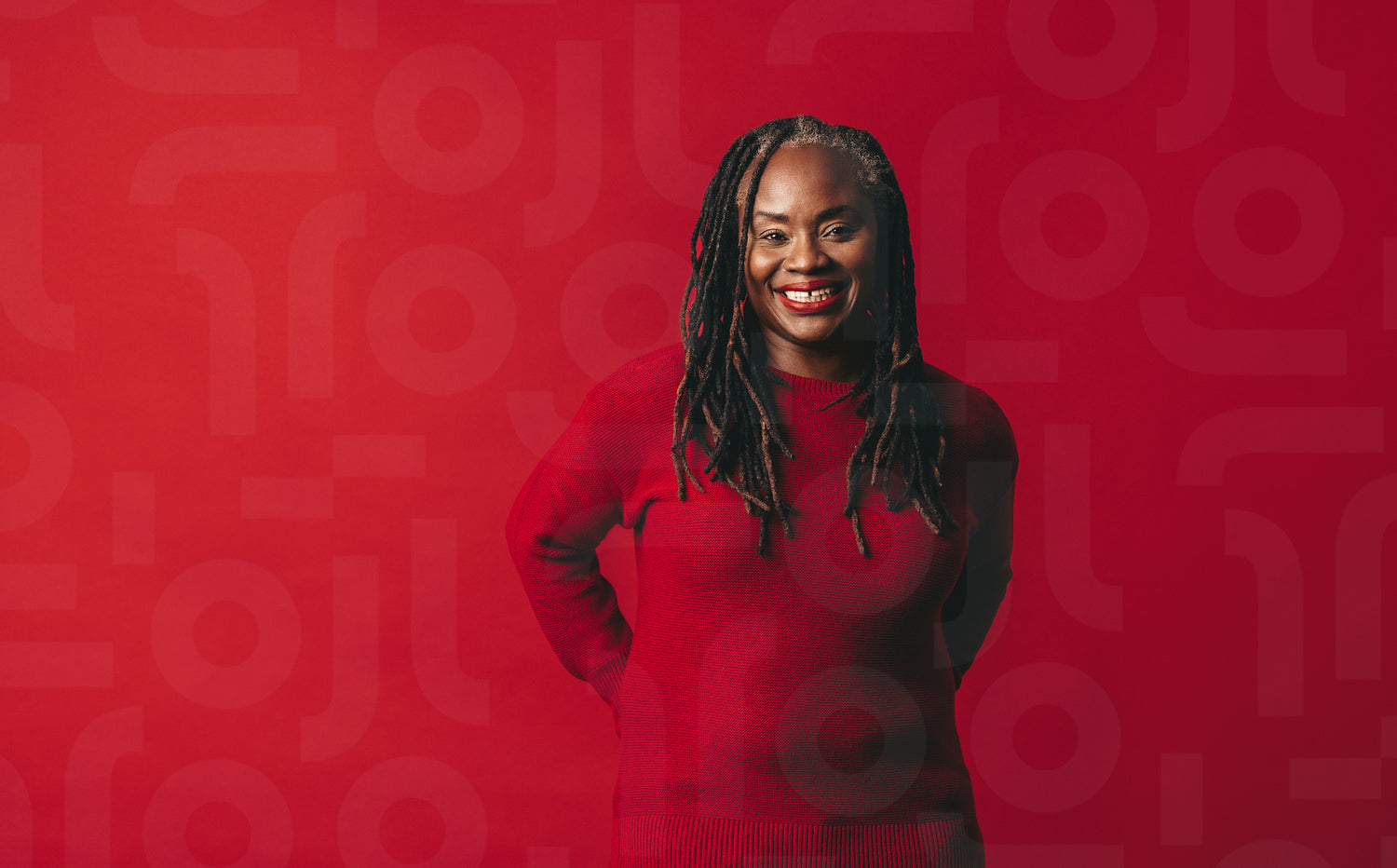 Black woman with dreadlocks smiling at the camera while standing against a red background. Happy mature woman embracing her natural hair with confidence.
