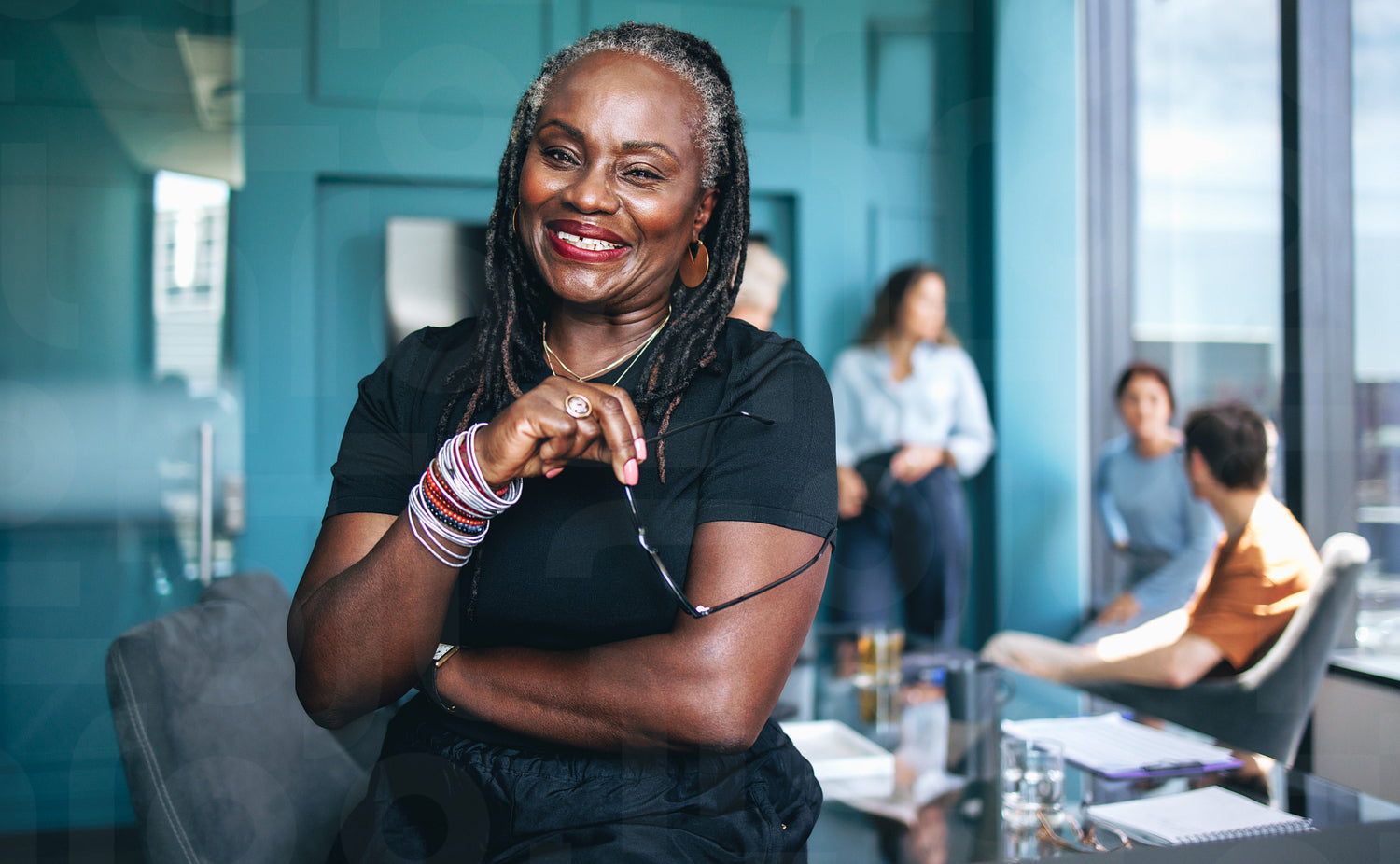 Woman with dreadlocks smiling at the camera in a business meeting
